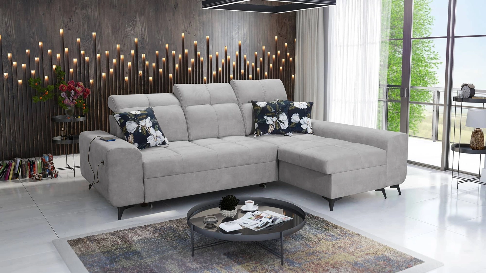 Dodatki tego mebla, które docenią wszyscy użytkownicy to pojemnik na pościel, regulowane zagłówki oraz gniazdo ładowania USB w boczku narożnika.