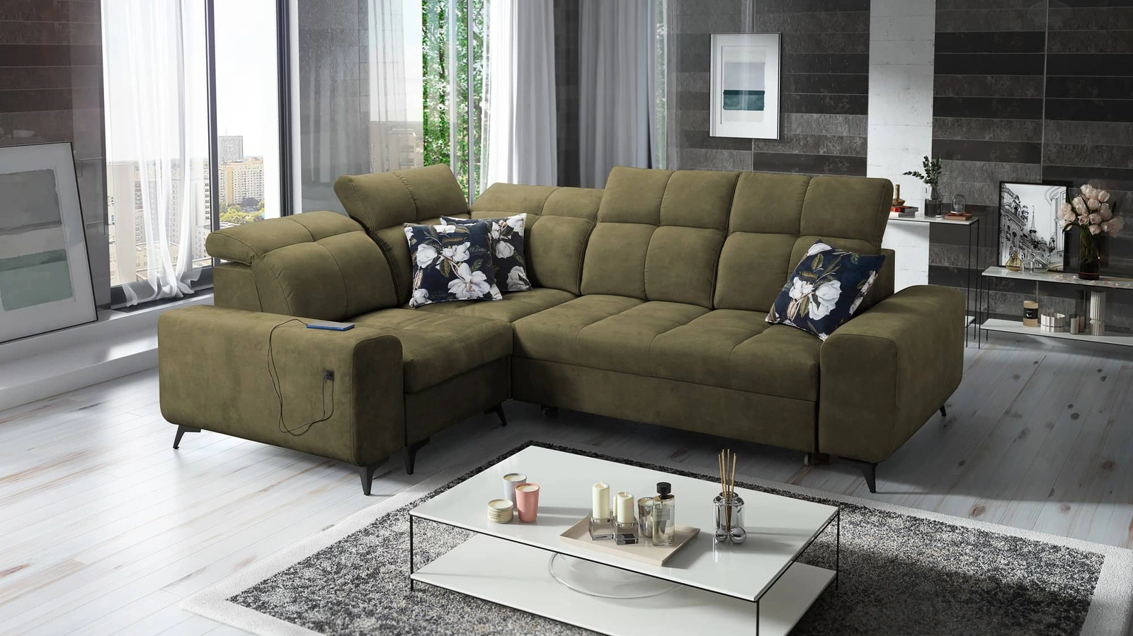 Narożnik z funkcją spania Buffalo II oliwkowy lewostronny funkcjonalny i stylowy narożnik rozkładany z regulowanymi zagłówkami