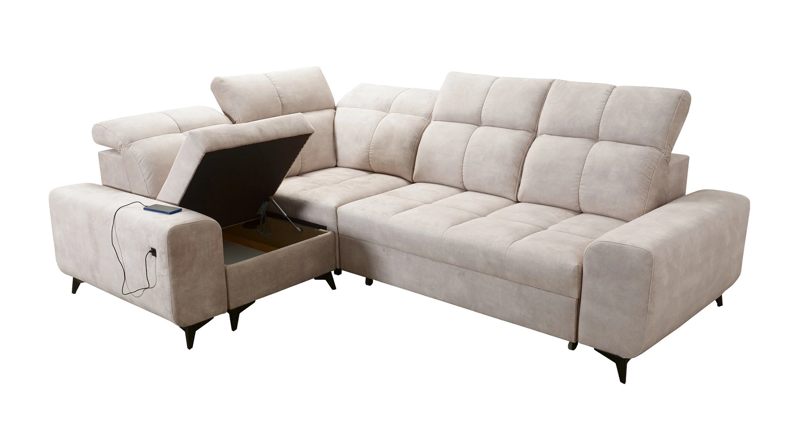 Dodatki tego mebla, które docenią wszyscy użytkownicy to pojemnik na pościel, regulowane zagłówki oraz gniazdo ładowania USB w boczku narożnika.