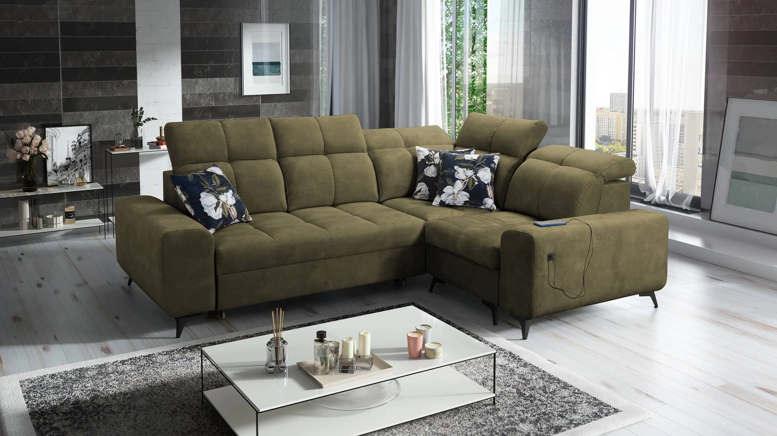 Narożnik z funkcją spania Buffalo II oliwkowy prawostronny funkcjonalny i stylowy narożnik rozkładany z regulowanymi zagłówkami