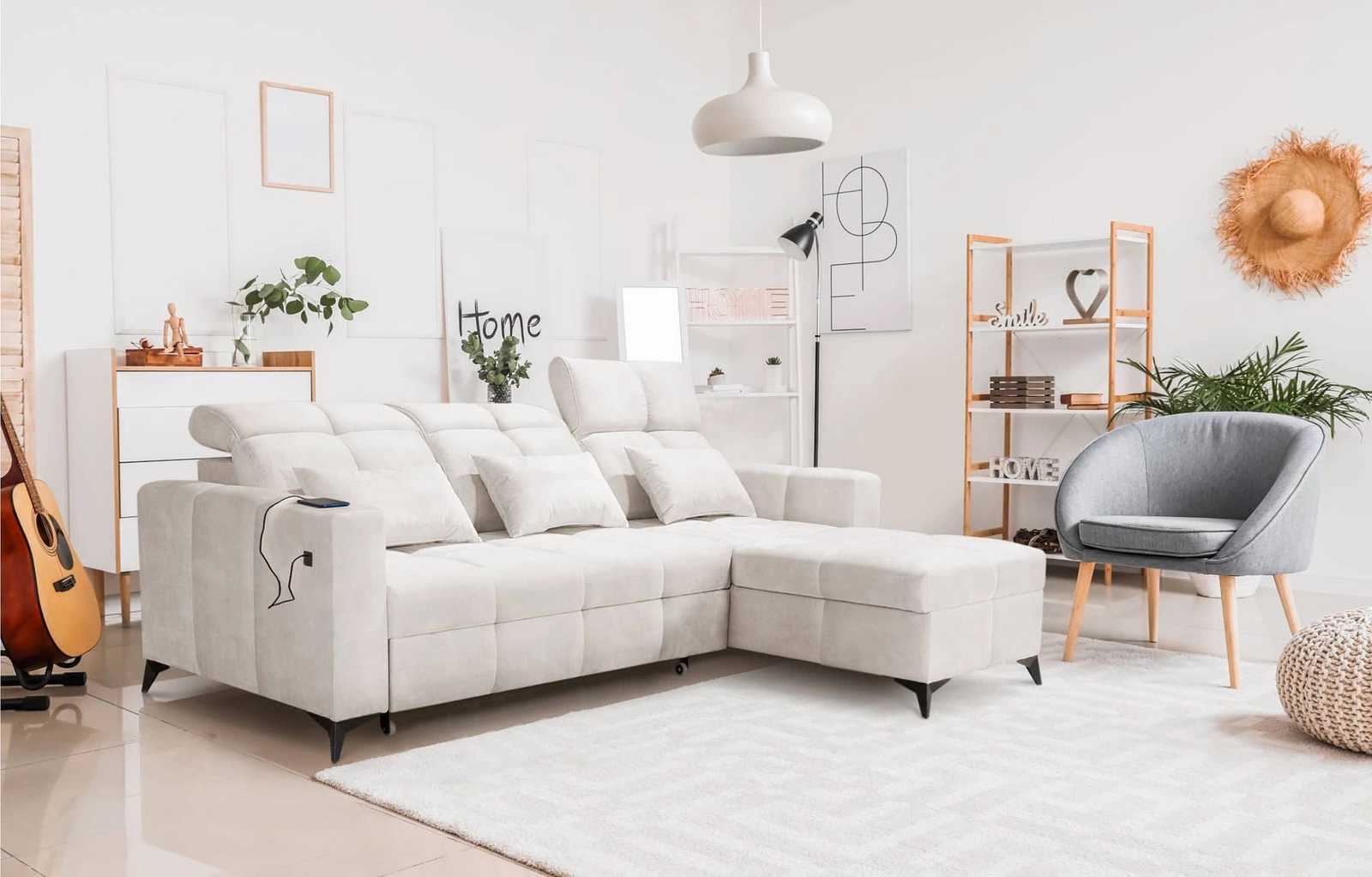 Dodatki tego mebla, które docenią wszyscy użytkownicy to pojemnik na pościel, regulowane zagłówki oraz gniazdo ładowania USB w boczku narożnika.