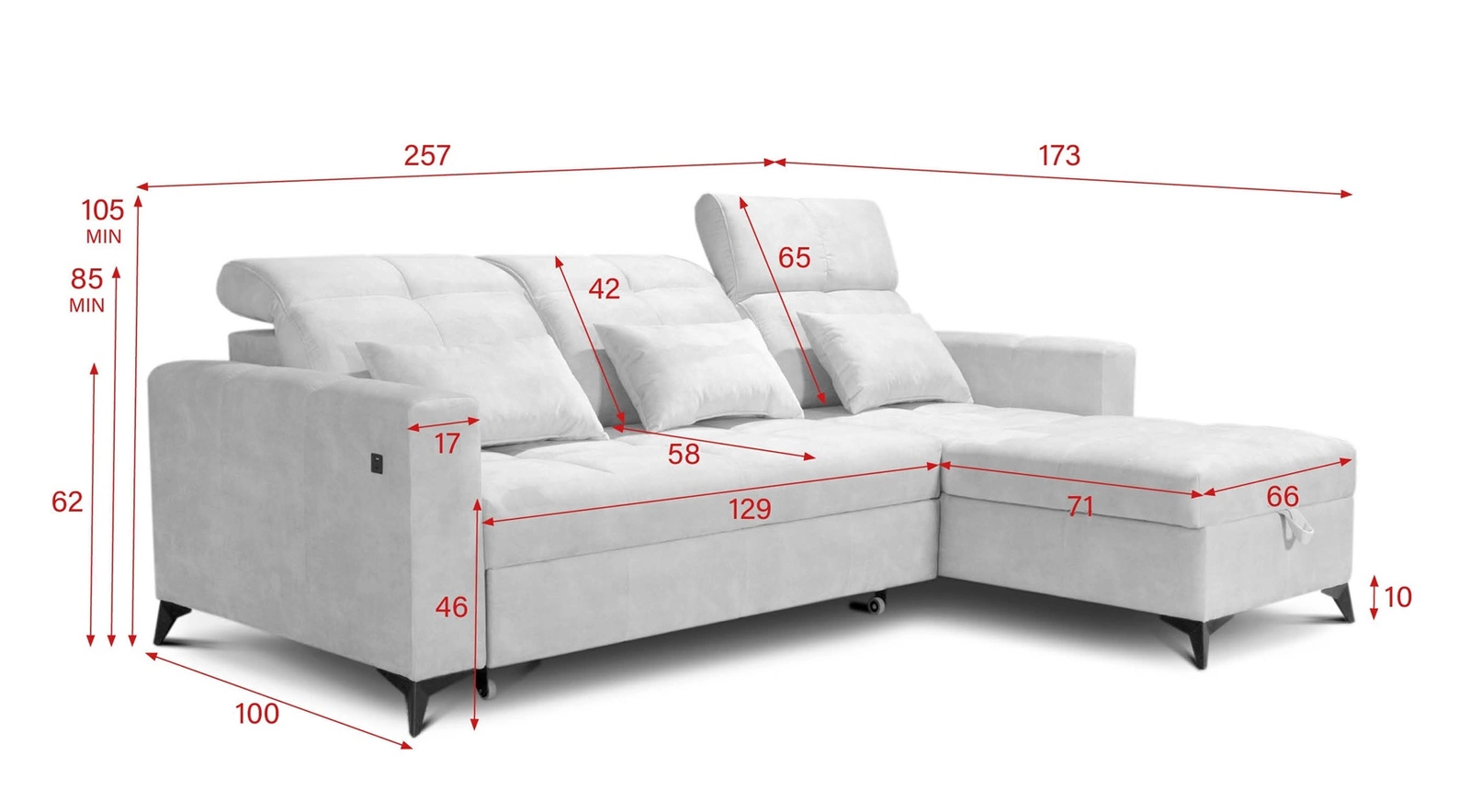 Wymiary mebla pozwolą na zapełnienie przestrzeni w przestronnym salonie lub pokoju dziennym. Szerokość narożnika 257 cm, wysokość maksymalna 105 cm oraz głębokość 173 cm. Powierzchnia spania narożnika wynosi 129x199 cm. Wysokość siedziska mebla to 46 cm a maksymalna wysokość oparcia wynosi 65 cm. Sprężyny faliste oraz pianka poliuretanowa T30 to materiał, z którego wykonane zostało siedzisko narożnika. Oparcie stałe z regulowanymi zagłówkami pozwoli na łatwe dostosowanie kąta nachylenia zagłówków do swoich preferencji oraz daje gwarancję wygodnego wypoczynku po długim dniu, które docenisz Ty, Twoi bliscy a także goście, którzy zasiądą na tym wyjątkowym narożniku.