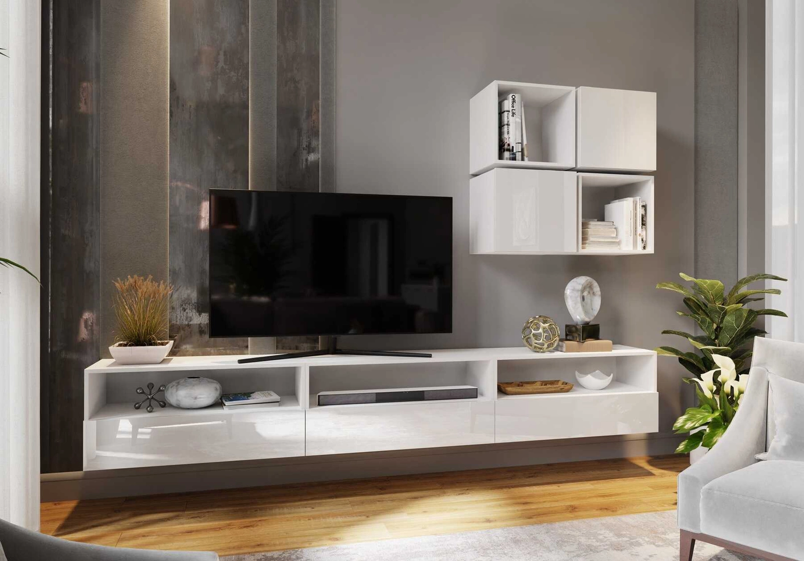 Korpus każdej z bryły wykonany został z wysokiej jakości płyty laminowanej o grubości 16mm, która charakteryzuje się odpornością na wpływ czynników zewnętrznych takich jak obicia, uderzenia i niefortunne zadrapania. Fronty szafki RTV wykonany z płyty MDF, oklejonej folią w połysku. Do otwierania drzwi i szuflad meblościanki do salonu zastosowano bezuchwytowy system push to open. Kultowa biel brył świetnie łączy się z innymi kolorami, dzięki czemu meble Dion świetnie sprawdzą się jako meblościanka do salonu lub meblościanka do pokoju dziennego.