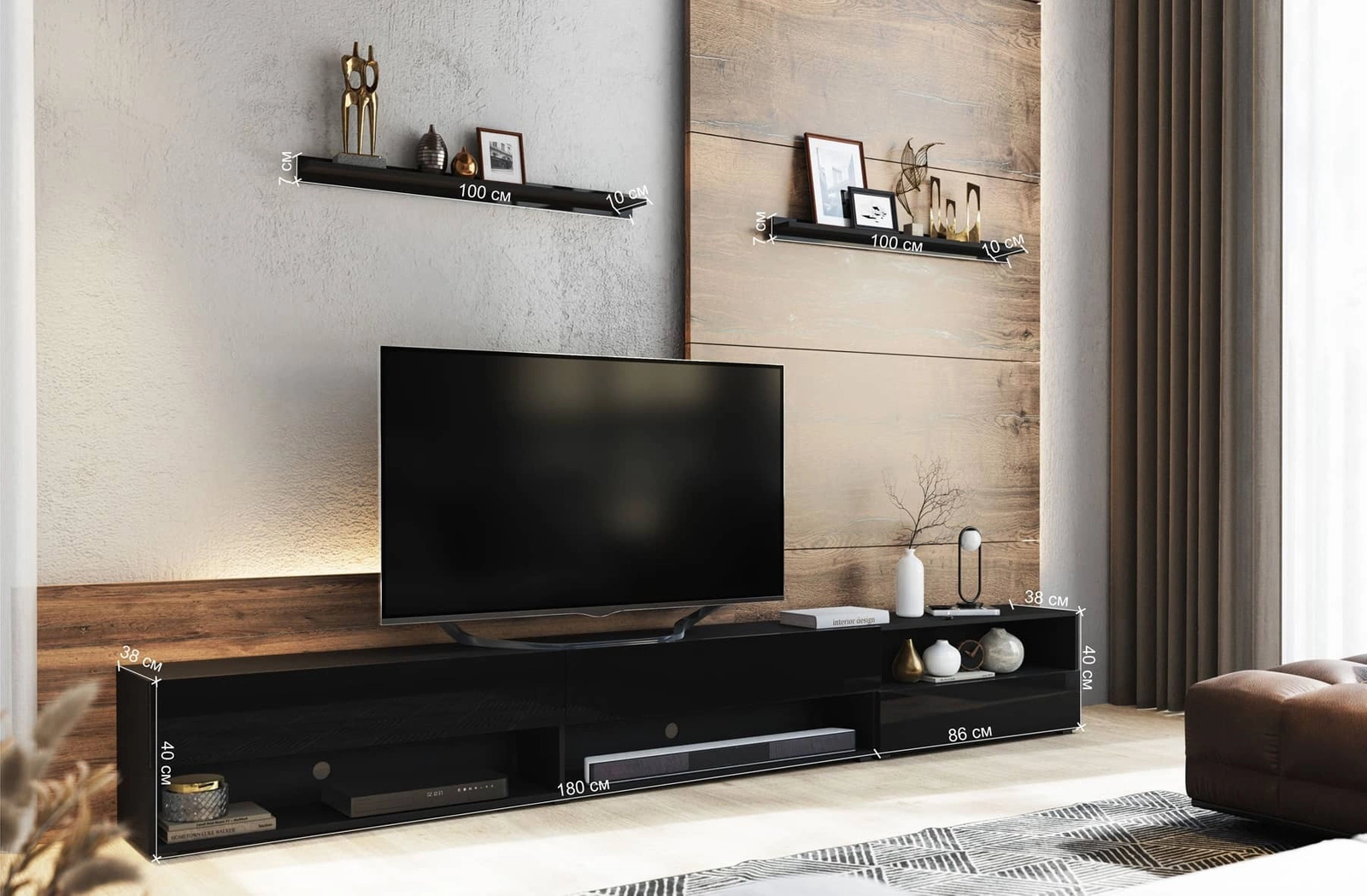 Szafka RTV Lawrio jest utworzona z dwóch elementów, które można ustawić w dowolny sposób, dopasowując układ zestawu do własnych potrzeb.