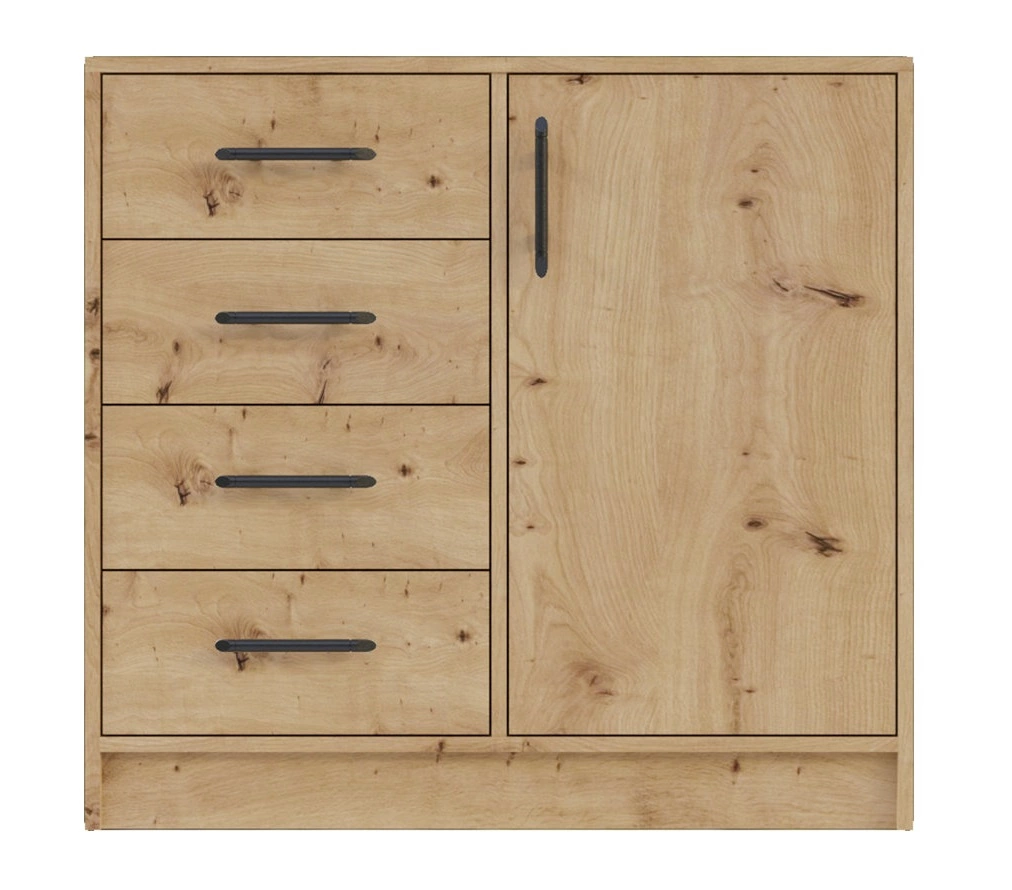 Komoda z kolekcji Caspe charakteryzuje się prostymi kształtami. Mebel skonstruowany jest z 1 drzwi i 4 szuflad wysuwanych na prowadnicach rolkowych. Dopełnieniem frontów komody są uchwyty w kolorze czarnym. Komoda została wykonana z wysokiej jakości płyty laminowanej o grubości 16mm, która charakteryzuje się odpornością na wpływ czynników zewnętrznych takich jak obicia, uderzenia i niefortunne zadrapania.