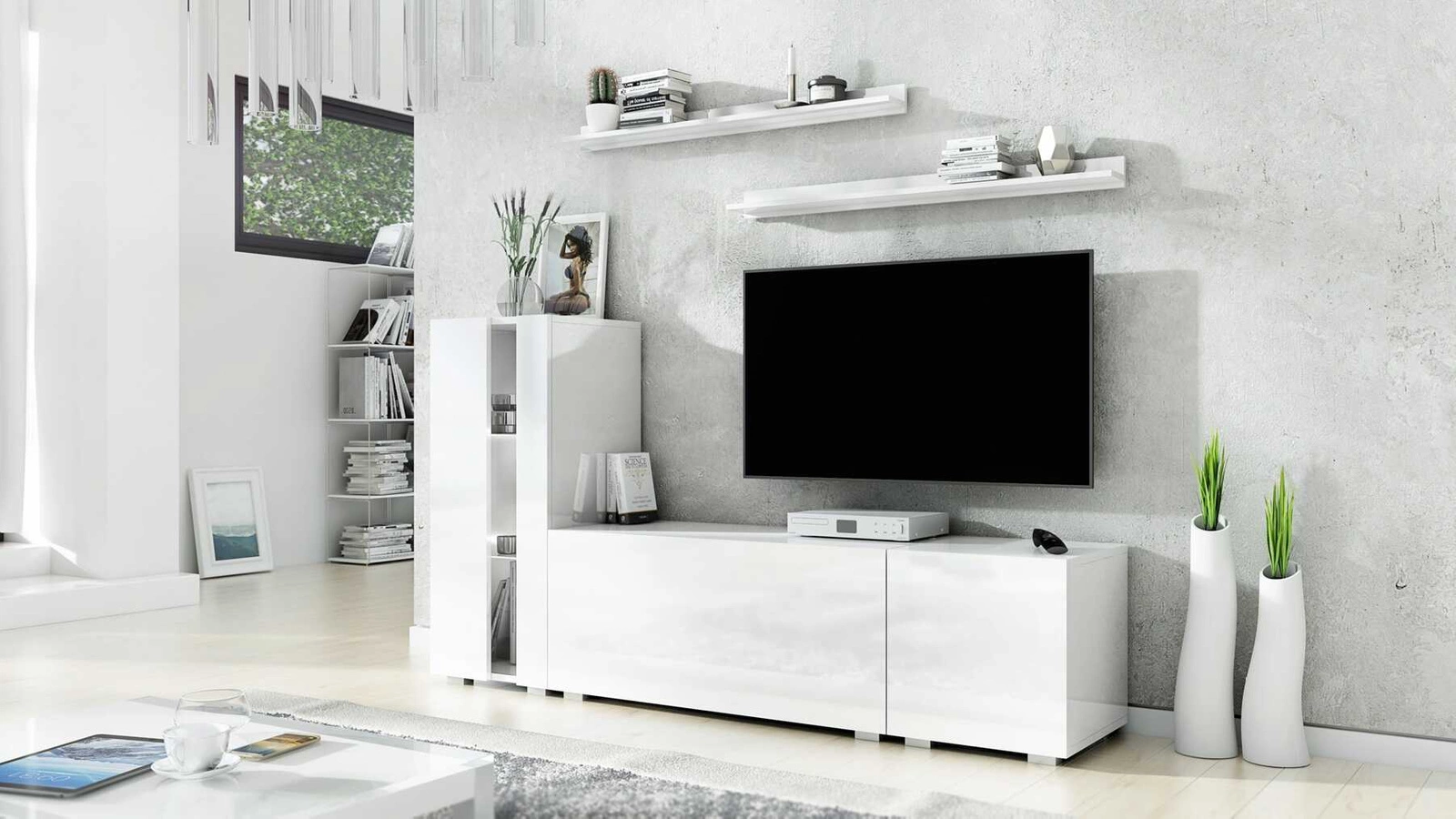 Meblościanka Oropos biała / biały połysk uniwersalna i stylowa meblościanka do salonu proste bryły wpisujące się w każde wnętrze