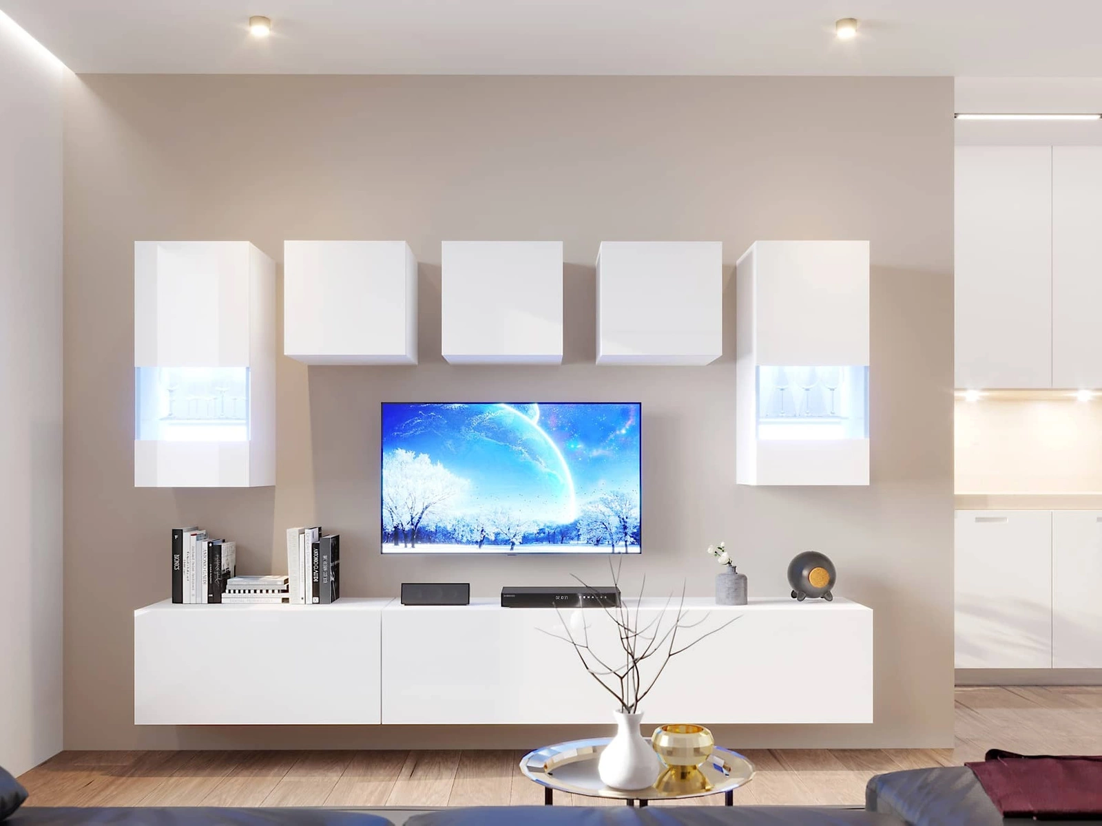 Meblościanka Kateri biała / biały połysk uniwersalna meblościanka do salonu o lekkiej stylistyce idealnie wkomponuje się w każde wnętrze