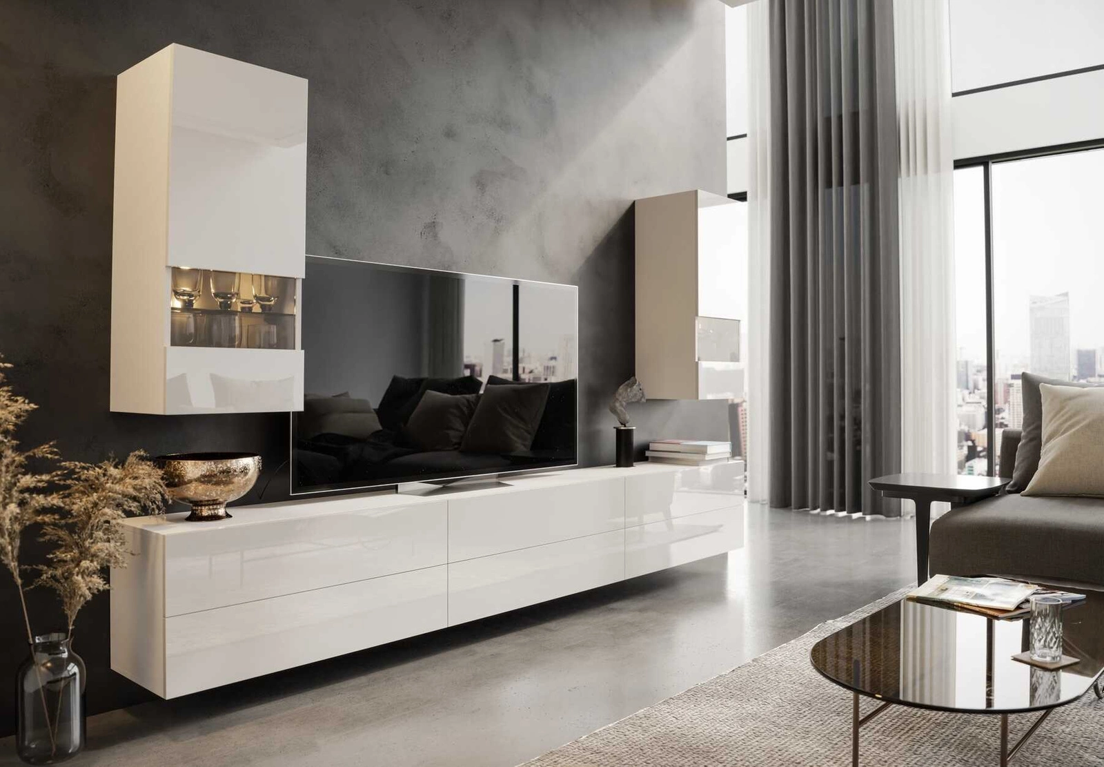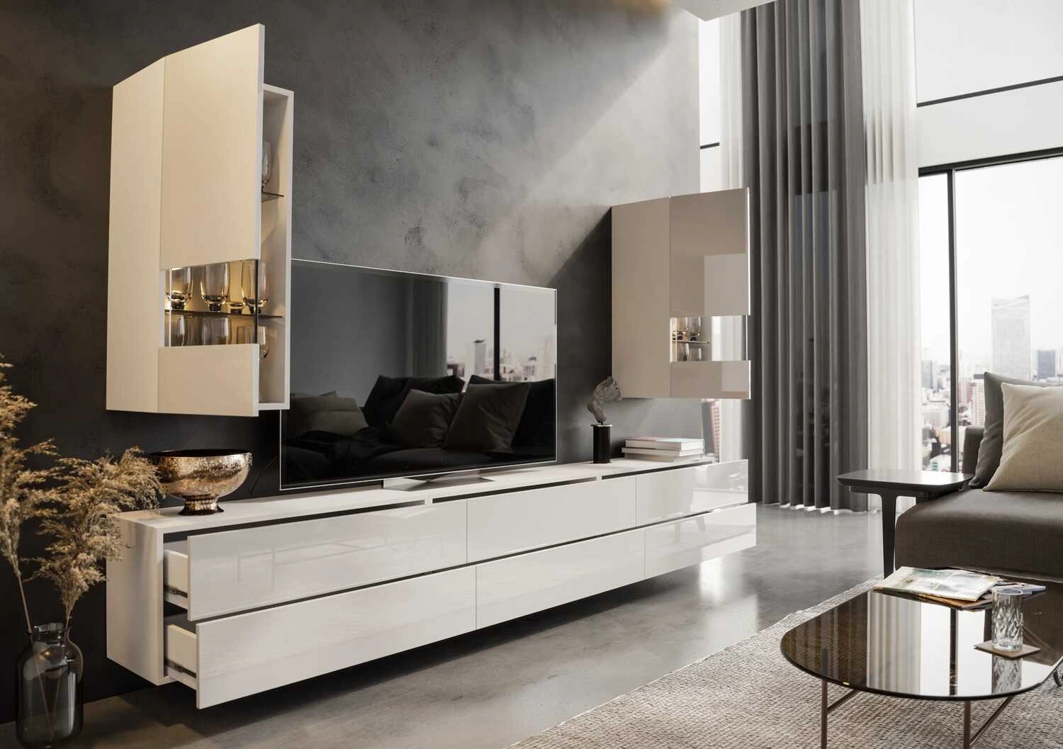 Meblościanka Pirgos biała / biały połysk minimalistyczny design meblościanka do salonu lub pokoju dziennego system push to open