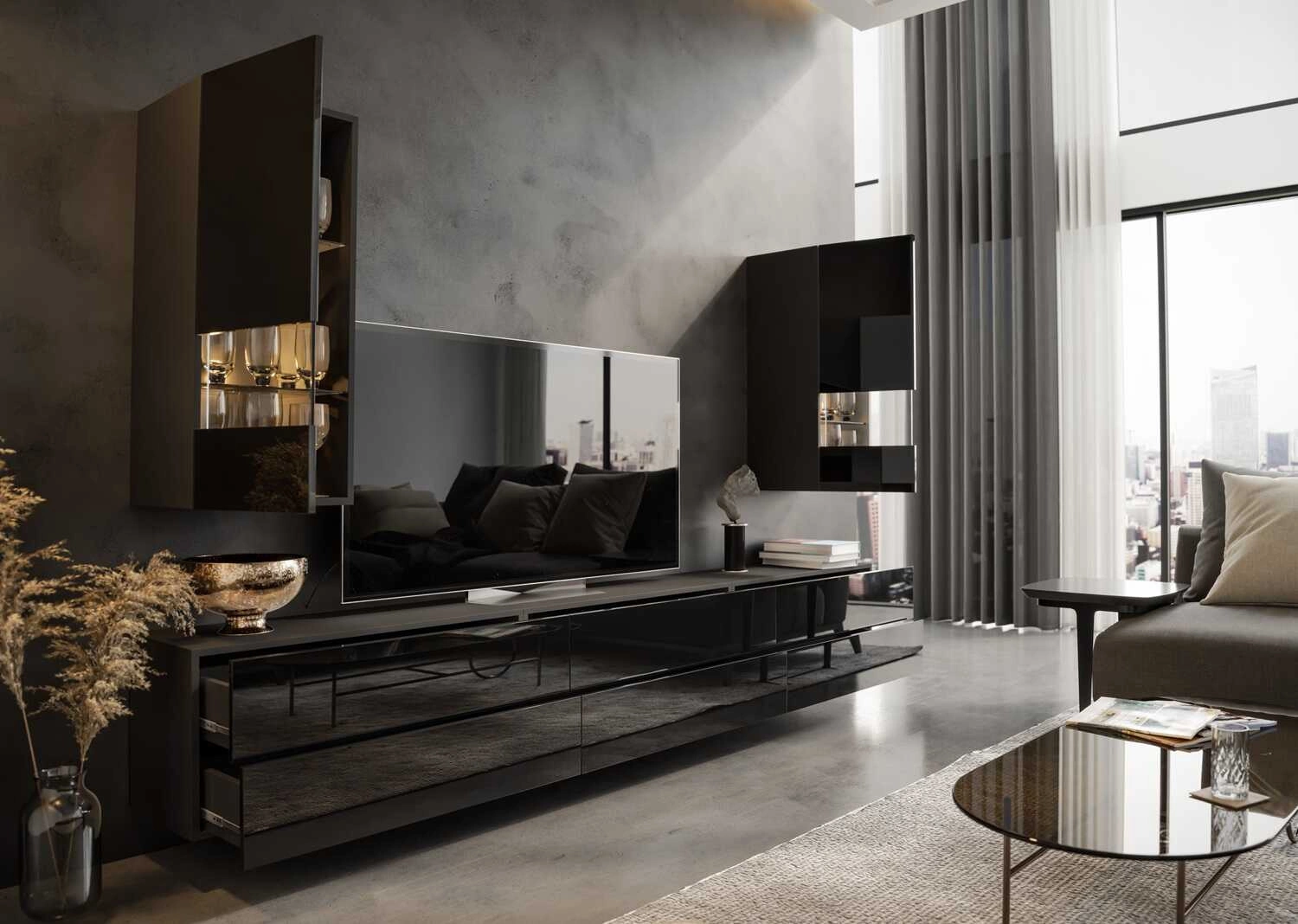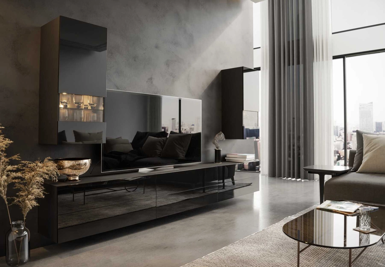 Meblościanka Pirgos czarna / czarny połysk minimalistyczny design meblościanka do salonu lub pokoju dziennego system push to open
