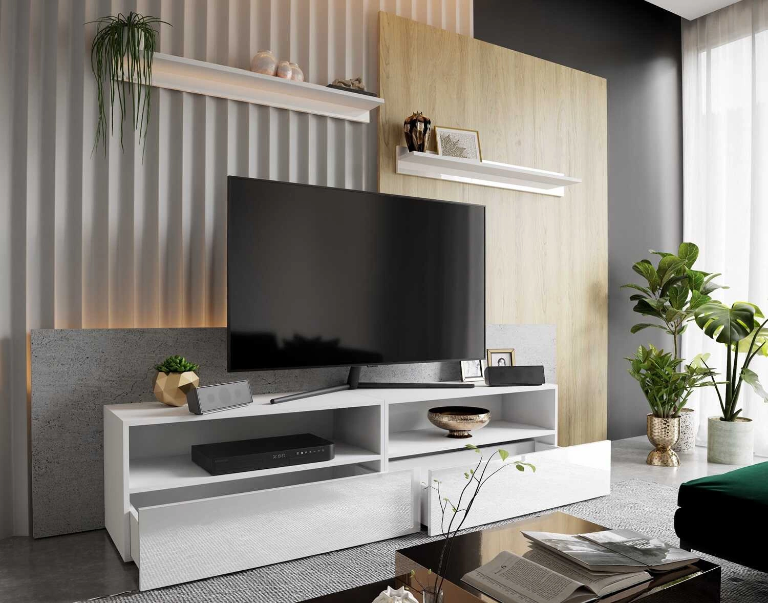 Szafka RTV Plisii 172 cm biała / biały połysk z możliwością powieszenia i półkami stylowy design wpisujący się w każde wnętrze