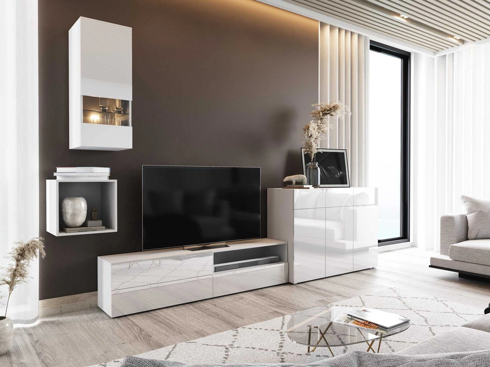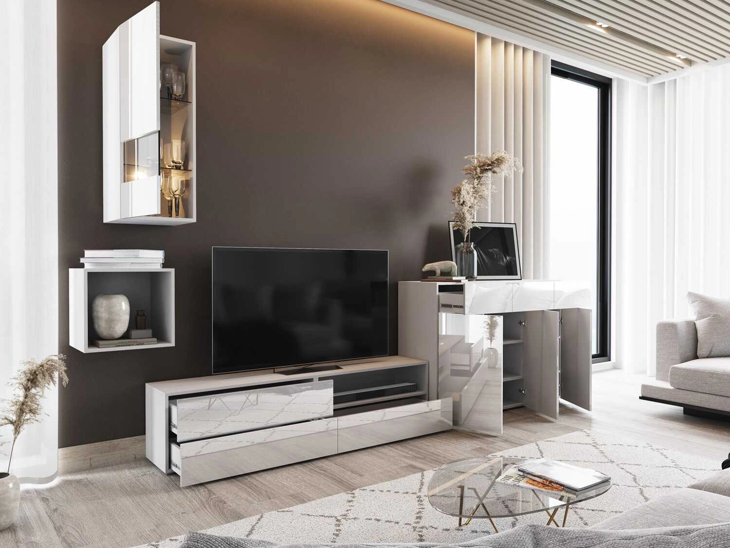 Meblościanka Pylos biała / biały połysk nowoczesny design system otwierania drzwi i szuflad push to open zestaw mebli z komodą