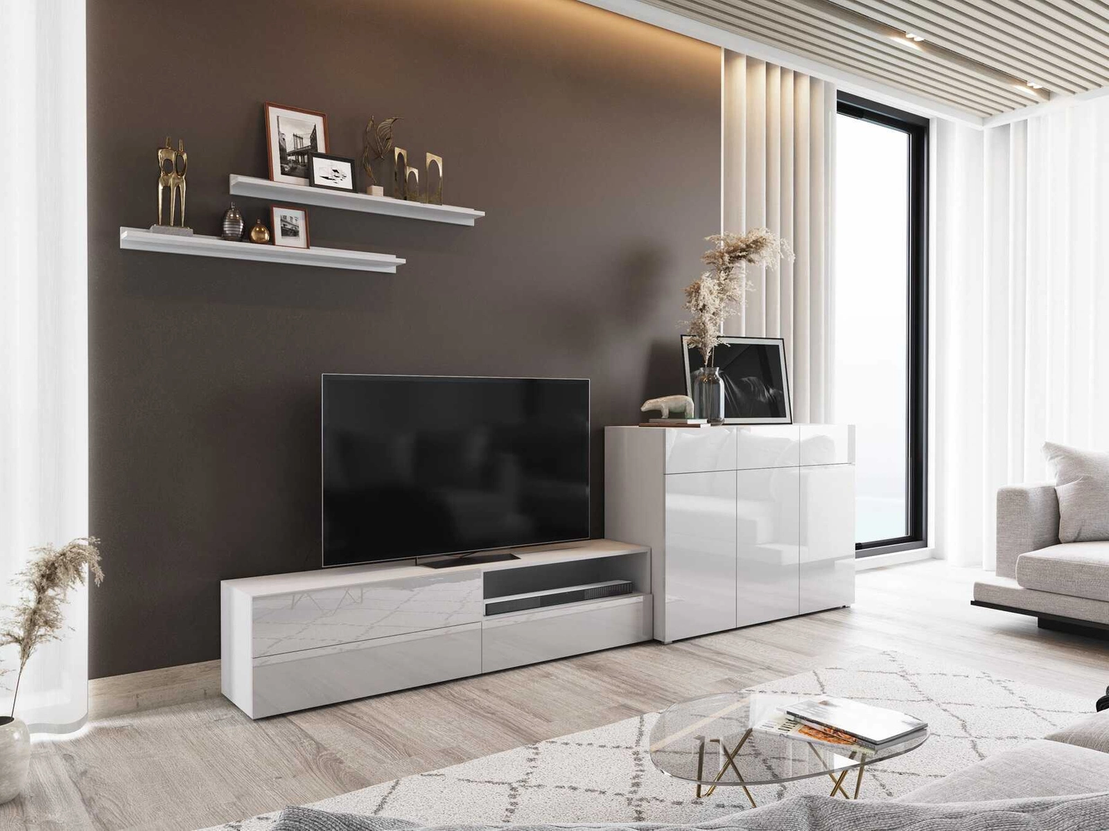 Meblościanka Aliartos biała / biały połysk nowoczesny design system otwierania drzwi i szuflad push to open zestaw mebli z komodą