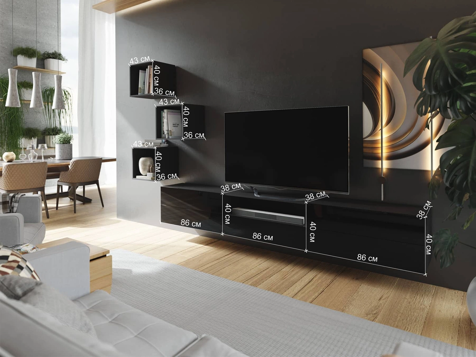 Meblościanka Sarti czarna / czarny połysk stylowy design funkcjonalny kącik multimedialny w niezwykle nowoczesnym stylu