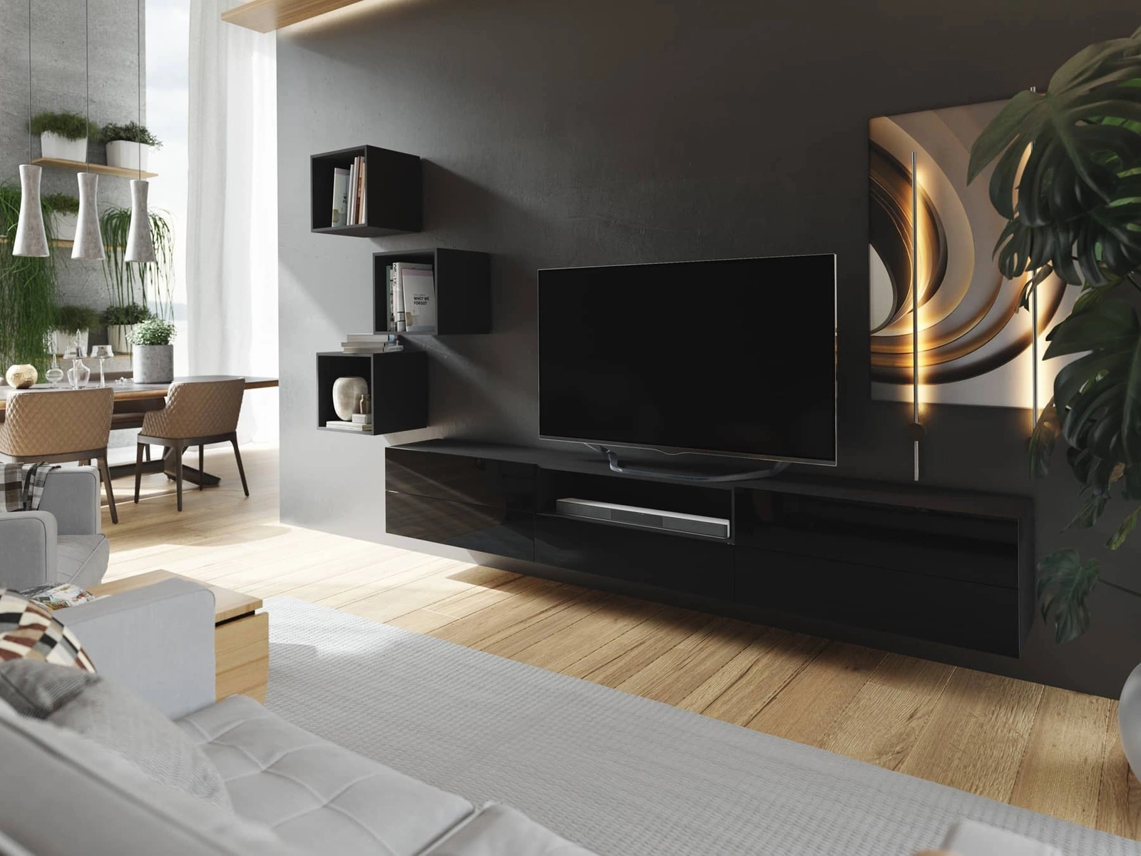 Korpus każdej z bryły wykonany został z wysokiej jakości płyty laminowanej o grubości 16mm, która charakteryzuje się odpornością na wpływ czynników zewnętrznych takich jak obicia, uderzenia i niefortunne zadrapania. Fronty szafki RTV wykonane z płyty MDF, oklejonej folią w połysku. Do otwierania szuflad mebli zastosowano bezuchwytowy system push to open. Kultowa czerń brył świetnie łączy się z innymi kolorami, dzięki czemu meble Sarti świetnie sprawdzą się jako meblościanka do salonu lub meblościanka do pokoju dziennego.