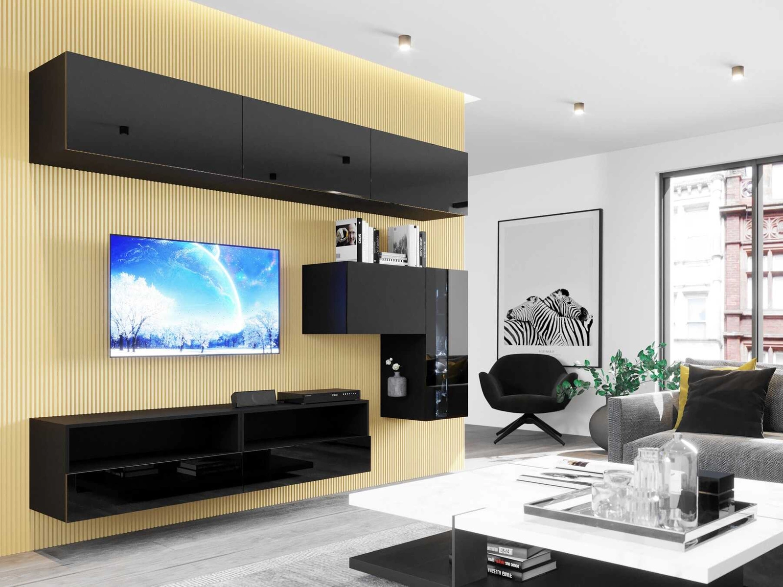 Drzwi witryny wiszącej są uniwersalne i można je zamontować po prawej lub po lewej stronie. Drzwi szafek poziomych zamykane są praktycznymi klapami. Do otwierania drzwi i szuflad mebli zastosowano bezuchwytowy system push to open. Ponadczasowa czerń brył świetnie łączy się z innymi kolorami, dzięki czemu meble Patras świetnie sprawdzą się jako meblościanka do salonu lub meblościanka do pokoju dziennego.