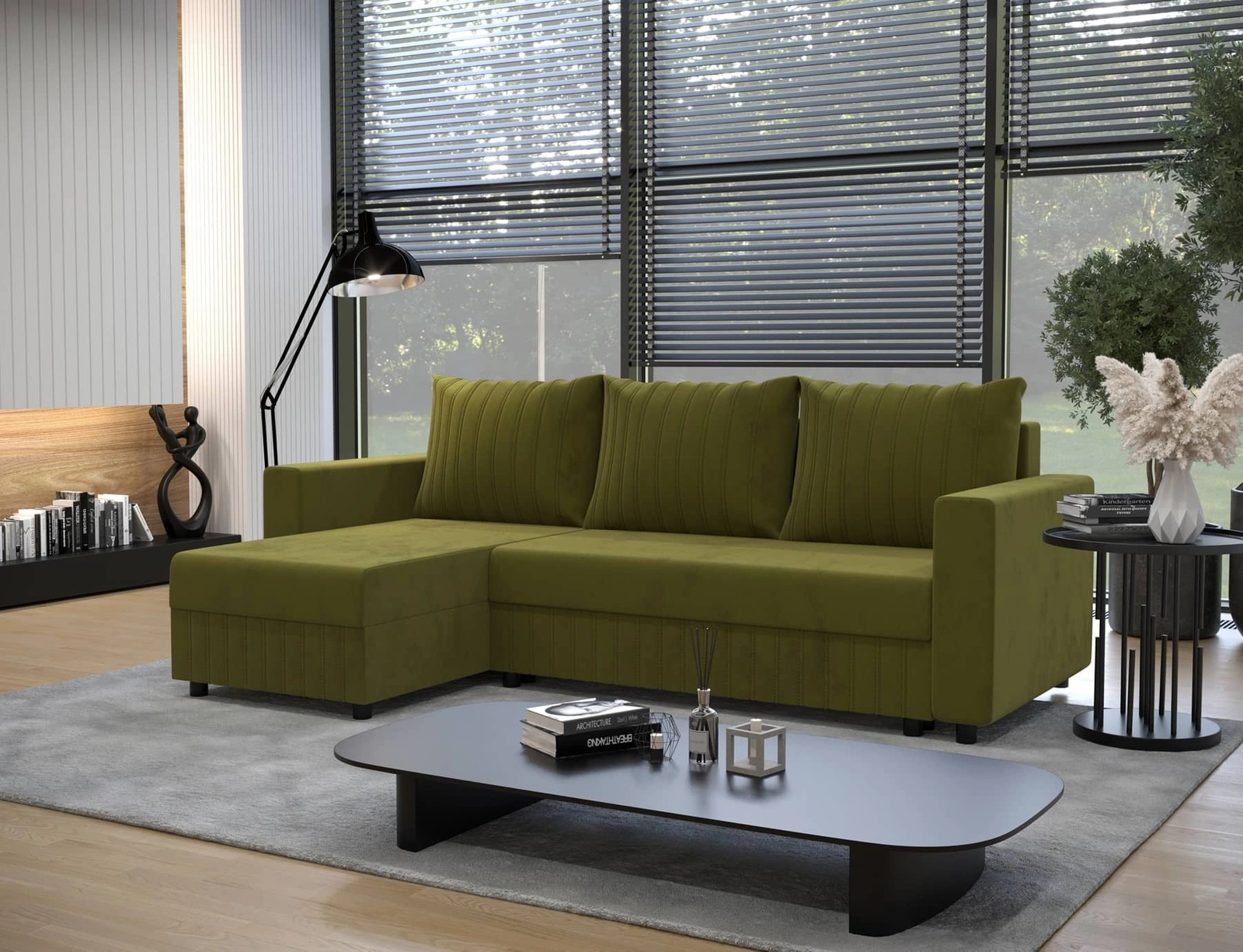 Narożnik z funkcją spania Pasco zielona oliwka lewostronny klasyczny narożnik wpisujący się w każdą aranżację dekoracyjne przeszycia