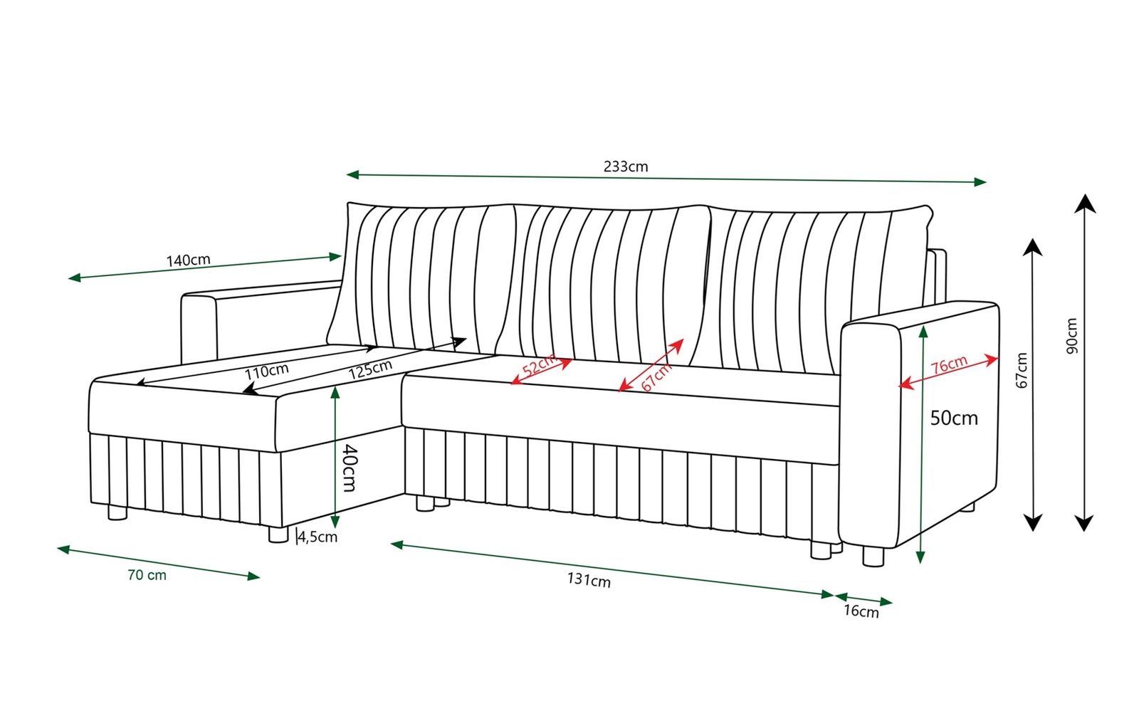 Wymiary mebla pozwolą na zapełnienie przestrzeni w przestronnym salonie lub pokoju dziennym. Szerokość narożnika 233 cm, wysokość 90 cm oraz głębokość 140 cm. Powierzchnia spania narożnika wynosi 125x201 cm. Wysokość siedziska mebla to 40 cm a maksymalna wysokość oparcia wynosi 50 cm. Sprężyny faliste oraz pianka poliuretanowa T30 to materiał, z którego wykonane zostało siedzisko narożnika. Oparcie poduchy daje gwarancję wygodnego wypoczynku po długim dniu, które docenisz Ty a także goście, którzy zasiądą na tym wyjątkowym narożniku.