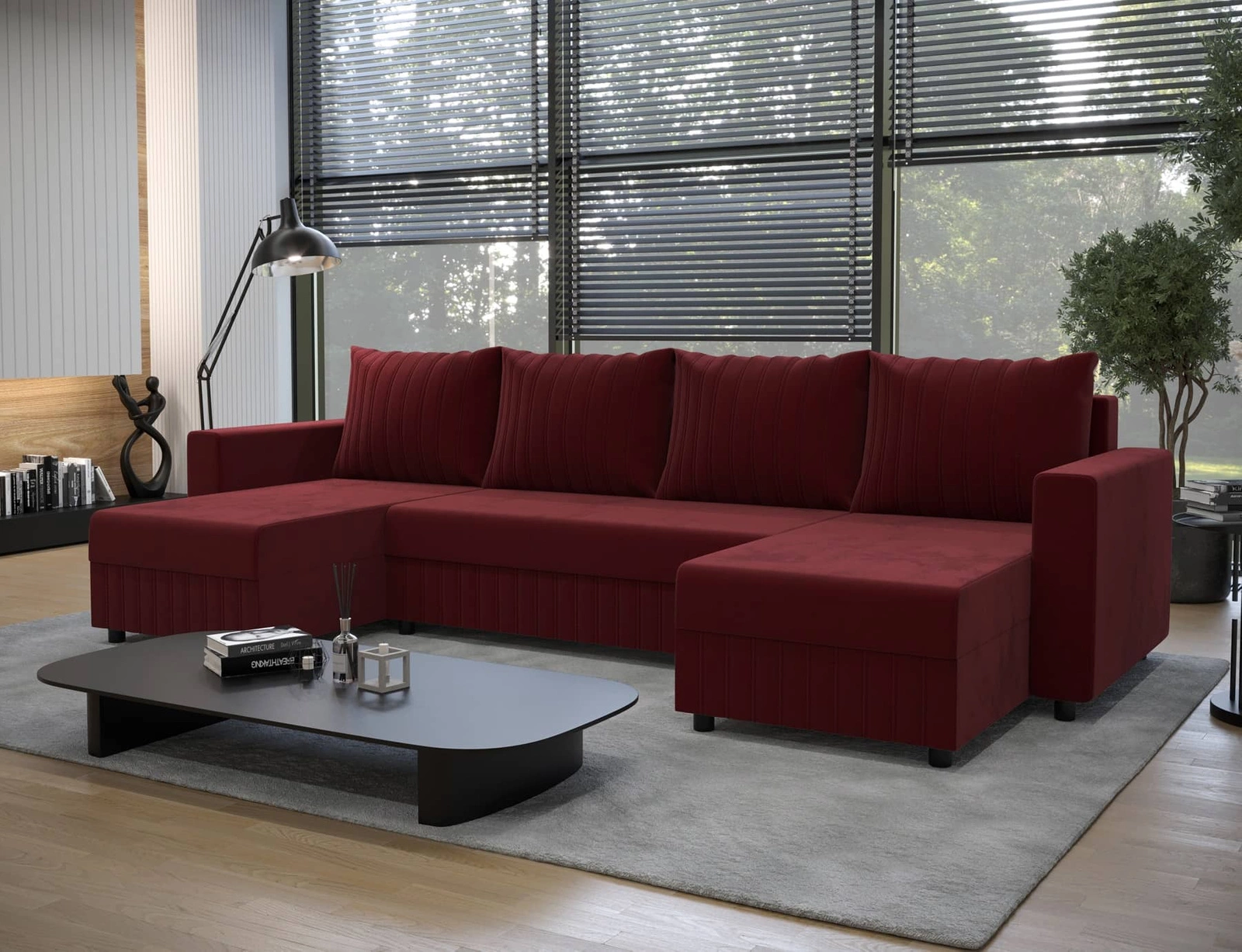 Narożnik z funkcją spania Pasco U burgundowy klasyczny design gustowna bryła z gwarancją funkcjonalności i komfortu miękka tkanina