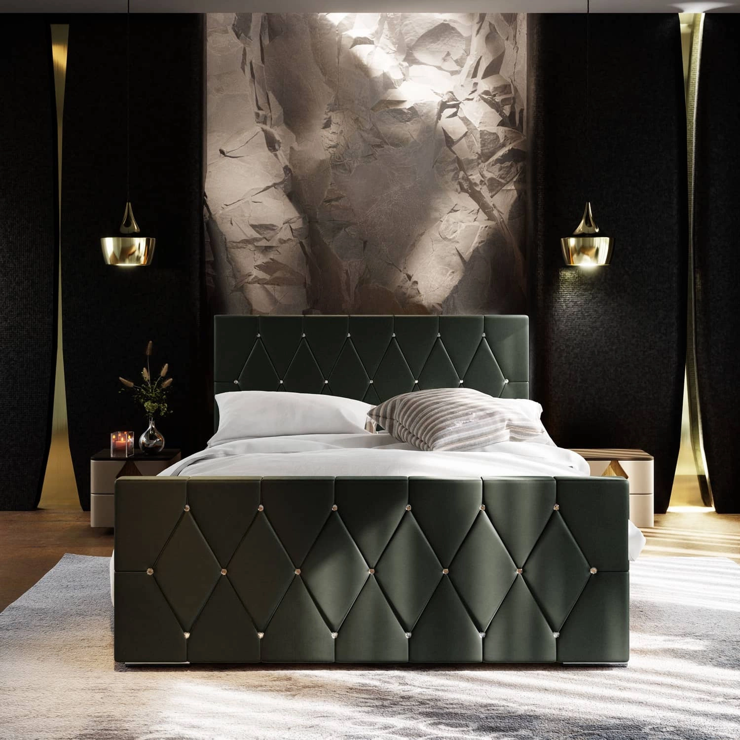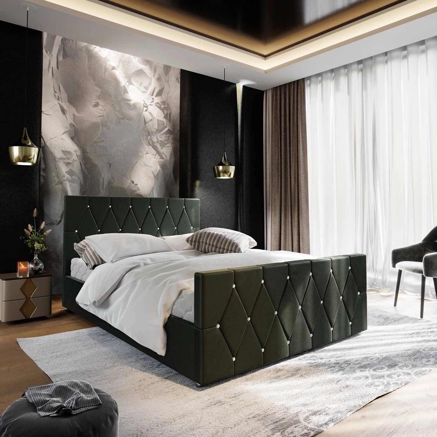 Łóżko tapicerowane Tifton 180x200 grafitowe z pojemnikiem w nowoczesnym stylu z charakterystycznym wezgłowiem oraz z zanóżkiem wykończone kryształkami