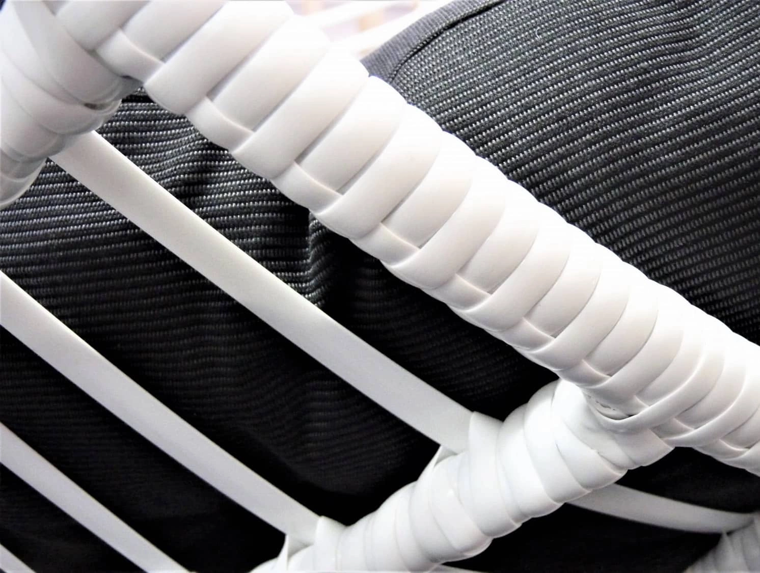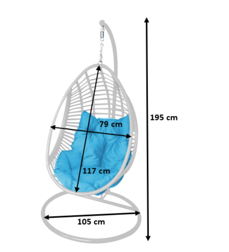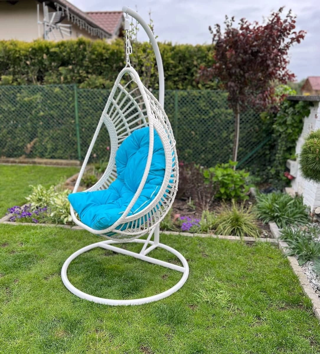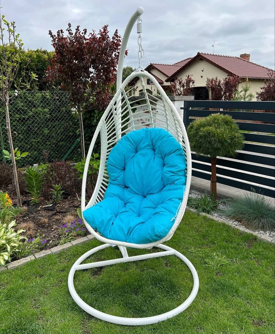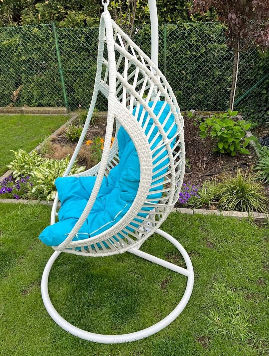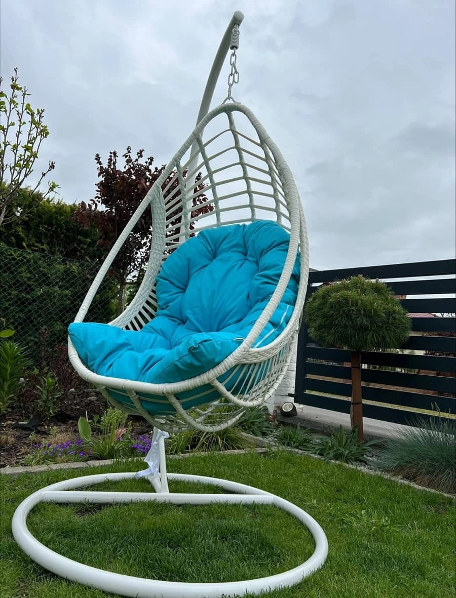 Fotel na taras wykonany został z wysokiej jakości technorattanu, który jest odporny na szkodliwe warunki atmosferyczne. Plecione siedzisko w białym kolorze nadaje wizualnej lekkości, a jego wnętrze wypełnione zostało miękką poduszką w kolorze niebieskim co zapewni jeszcze większy komfort i wygodę użytkowania tego niezwykle modernistycznego fotela ogrodowego. Fotel wiszący umieszczony został na stabilnym stalowym stelażu pomalowanym na biało co zapewnia bezpieczne użytkowanie fotela.