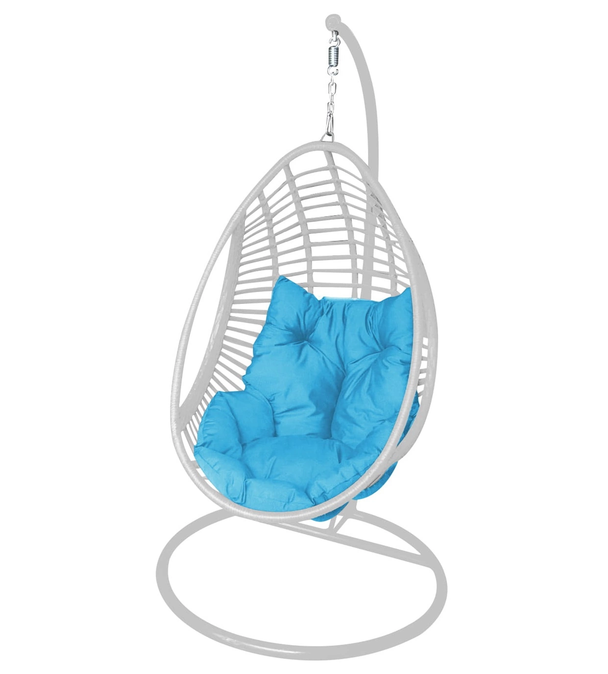 Fotel wiszący Bellissimo biały uniwersalny fotel z niebieską poduchą do ogrodowej strefy wypoczynku odporny na warunki atmosferyczne