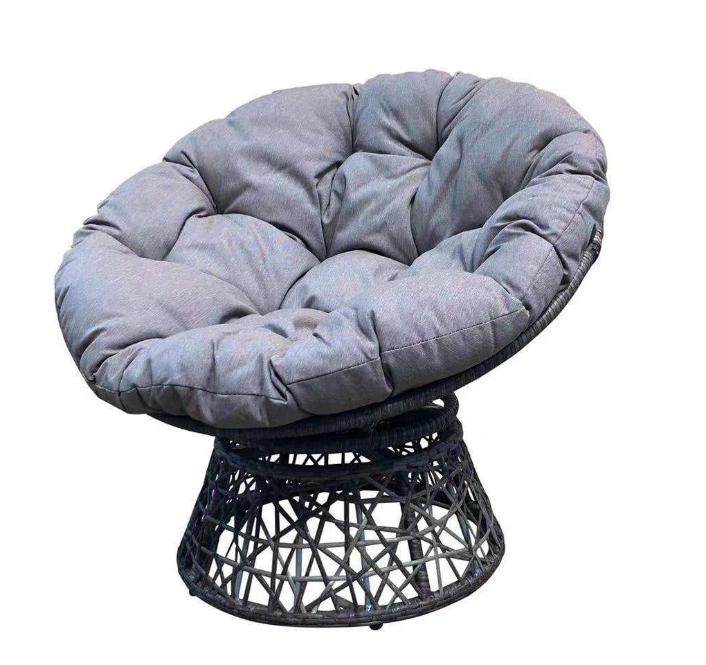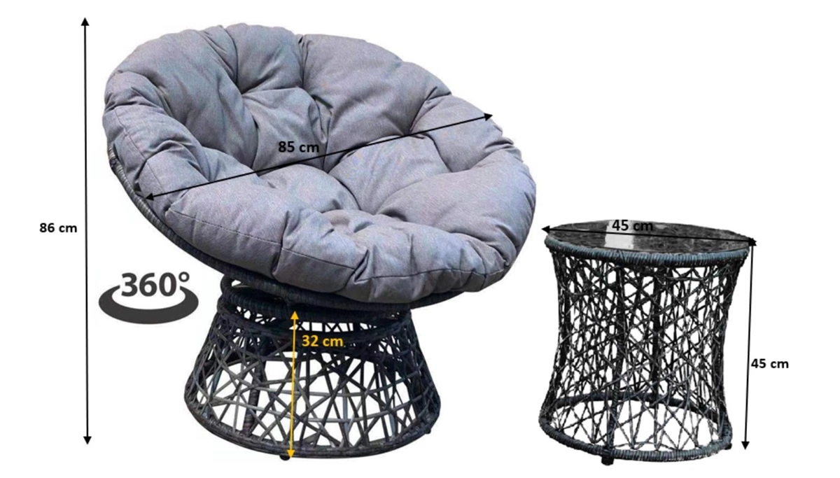 Fotel na taras wykonany został z wysokiej jakości technorattanu, który jest odporny na szkodliwe warunki atmosferyczne. Plecione siedzisko w szarym odcieniu nadaje wizualnej lekkości, a jego wnętrze wypełnione zostało miękką poduszką co zapewni jeszcze większy komfort i wygodę użytkowania tego niezwykle modernistycznego fotela ogrodowego. Fotel ogrodowy umieszczony został na stabilnej stalowej podstawie wykończonej technorattanem, zapewnia to bezpieczne użytkowanie fotela. Niewątpliwą zaletą fotela ogrodowego jest funkcja obrotu siedziska aż o 360 stopni.