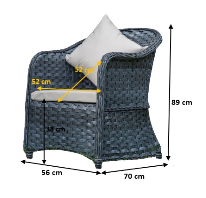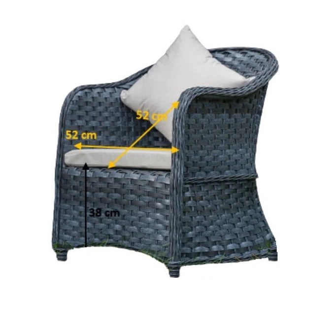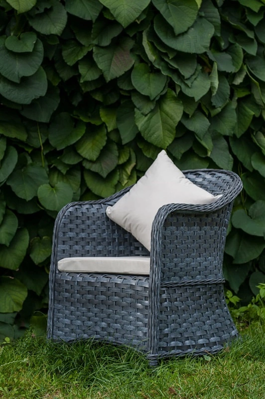 Fotel na taras wykonany został z wysokiej jakości technorattanu, który jest odporny na szkodliwe warunki atmosferyczne. Plecione siedzisko w szarym odcieniu nadaje wizualnej lekkości, a jego wnętrze wypełnione zostało miękkimi poduszkami co zapewni jeszcze większy komfort i wygodę użytkowania tego niezwykle gustownego fotela ogrodowego. Fotel ogrodowy umieszczony został na wytrzymałym metalowym stelażu. Całość konstrukcji zapewnia bezpieczne użytkowanie fotela.
