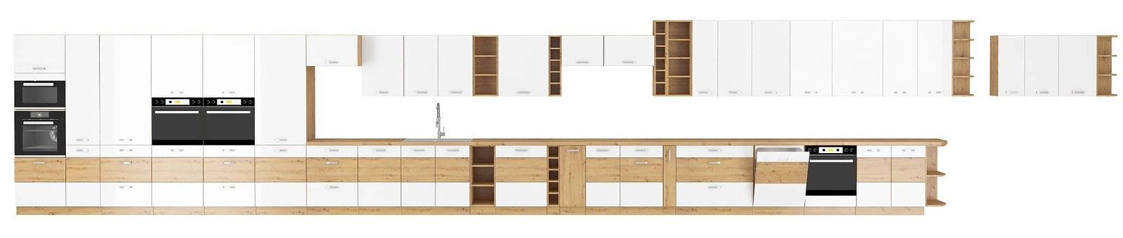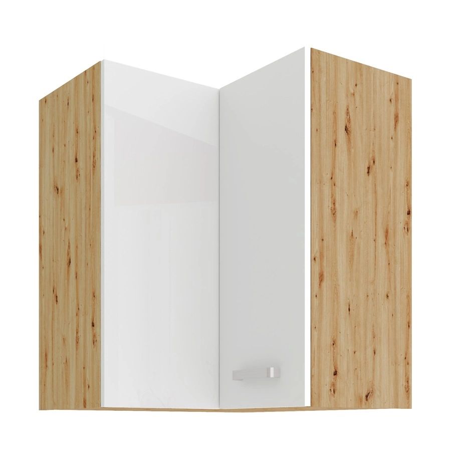 Szafka kuchenna narożna wisząca Alpine w kolorze biały / dąb artisan należy do kategorii mebli kuchennych modułowych, z których można utworzyć dowolne zestawy.