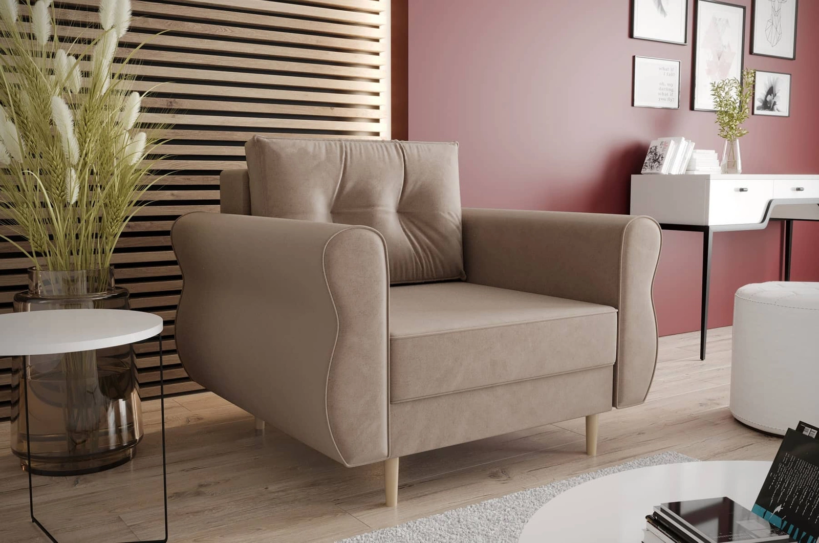Fotel Wilkins jasny brąz elegancki fotel do salonu z obszernym i miękkim siedziskiem drewniane nóżki nadają wizualnej lekkości