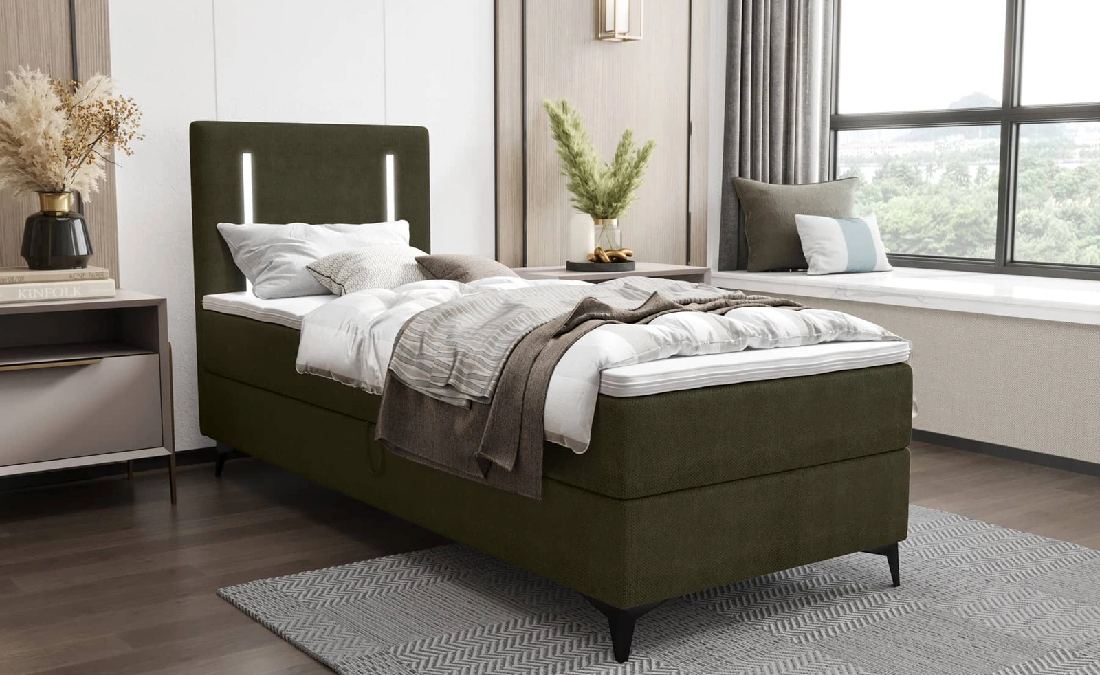 Łóżko kontynentalne Norco 80x200 zielone stylowe łóżko z pojemnikiem oświetlenie umieszczone w zagłówku nadaje wyjątkowości