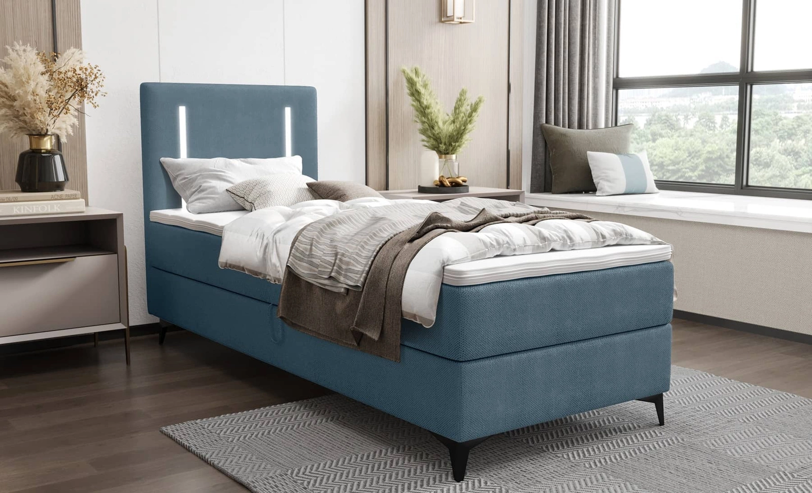 - Łóżko kontynentalne Norco to doskonały wybór do mniejszej sypialni lub pokoju młodzieżowego. Wysokie wezgłowie oraz pionowe oświetlenie LED przyciąga wzrok i nadaje oryginalnego charakteru. Miękka i delikatna tkanina obiciowa dopełnia całości aranżacji.