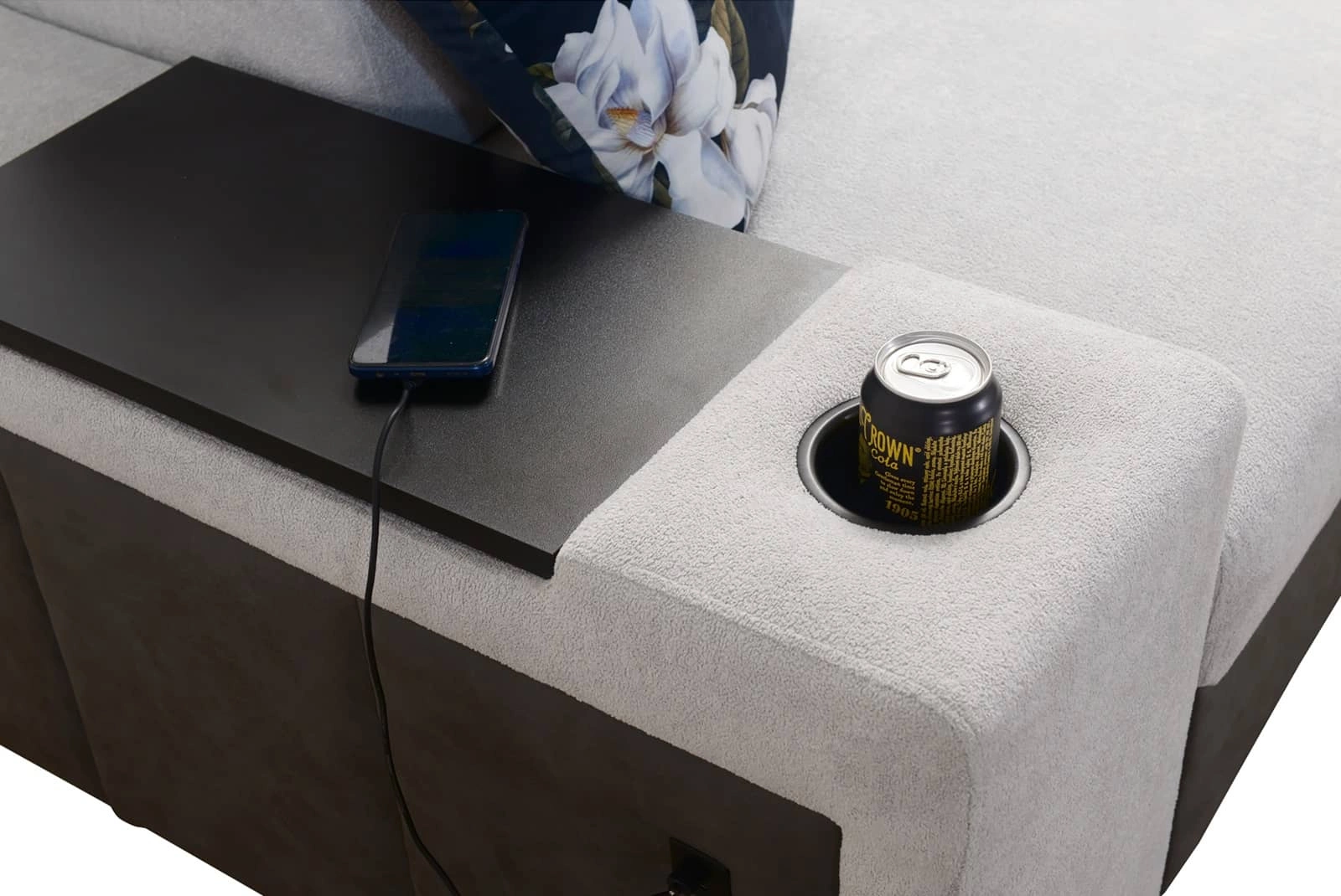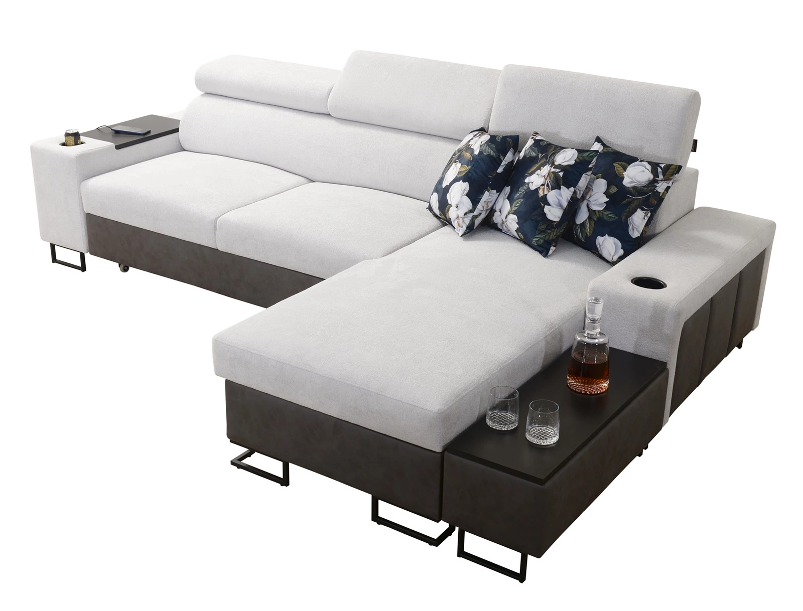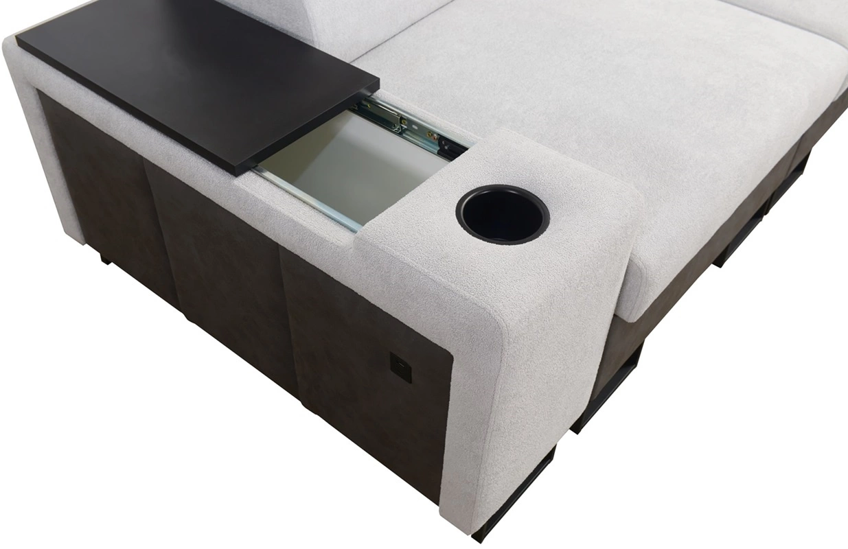 Dodatki tego mebla, które docenią wszyscy użytkownicy to gniazdo ładowania USB, otwierany barek w boczku narożnika oraz uchwyty na kubki.