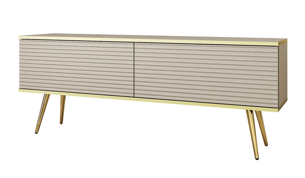 Szafka RTV Luxury 135 cm beżowa elegancki design stylowy ryflowany front korpus zwieńczony złotą listwą złote metalowe nogi
