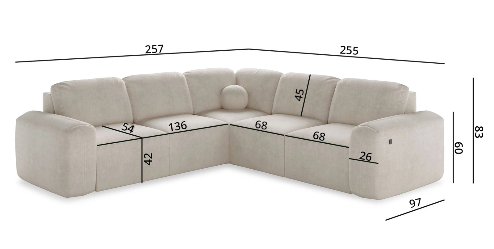Wymiary mebla pozwolą na zapełnienie przestrzeni w przestronnym salonie lub pokoju dziennym. Szerokość narożnika 257 cm, wysokość 83 cm oraz głębokość 255 cm. Powierzchnia spania narożnika wynosi 125x205 cm. Wysokość siedziska mebla to 42 cm a wysokość oparcia wynosi 45 cm. Sprężyny faliste oraz pianka poliuretanowa T30 to materiał, z którego wykonane zostało siedzisko narożnika. Miękkie poduchy oparciowe zapewnią wysoki komfort podczas codziennego odpoczynku, który docenisz Ty a także goście, którzy zasiądą na tym wyjątkowym narożniku.