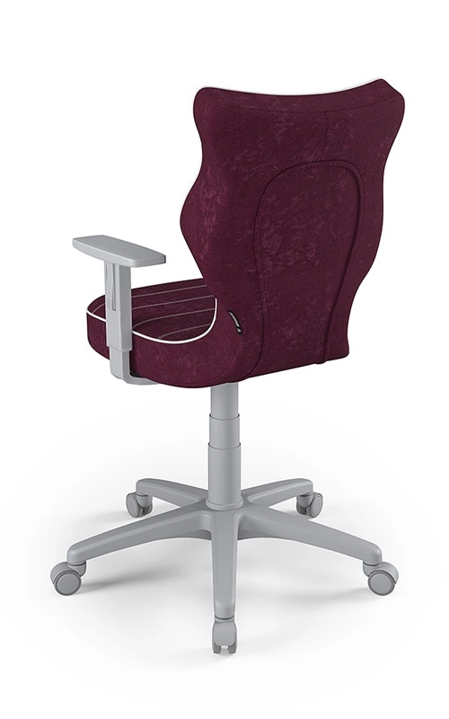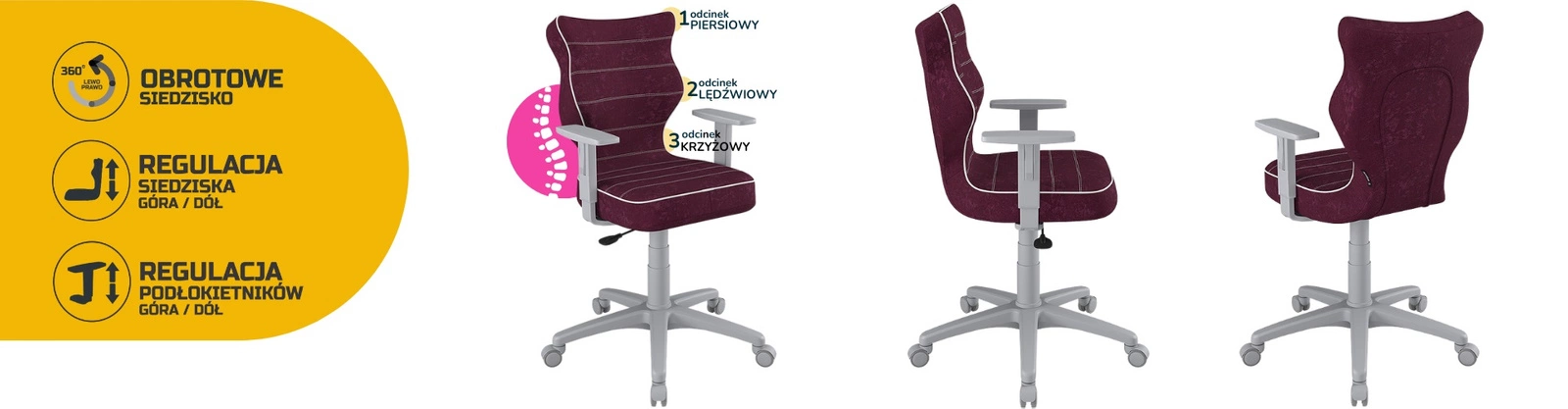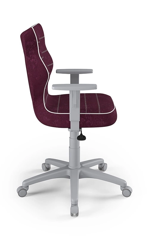 Krzesło obrotowe Duo to doskonały wybór dla każdego nastoletniego oraz dorosłego użytkownika, które zapewni niezwykłą wygodę i bezpieczeństwo. Krzesło idealnie wpasuje się w każdą aranżację pokoju dziecięcego, pokoju młodzieżowego lub biura. Zestawienie tkaniny w fioletowym odcieniu z szarą podstawą nadaje całości nowoczesności i uczynią krzesło stylowym dodatkiem wnętrza. Niezwykle ergonomiczne siedzisko zostało obszyte tkaniną Visto 07, która wykazuje dużą odporność na ścieranie oraz jest łatwa do utrzymania w czystości. Dodatkowo siedzisko wzbogacone jest białą lamówką, która stanowi nietuzinkową ozdobę krzesła do biurka. Dzięki właściwościom tkaniny krzesło obrotowe przez długi czas zachowa swój nieskazitelny wygląd. Krzesło do biurka Duo oferuje uniwersalną wszechstronność sprawdzając się nie tylko podczas nauki, ale także gry i pracy.