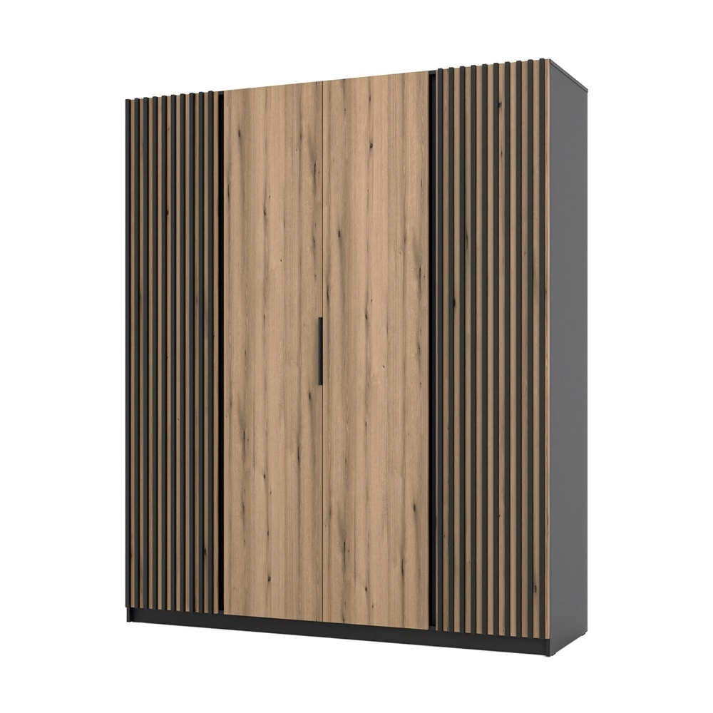 Szafa Kastano XI 200 cm czarny / dąb evoke nowoczesny design drzwi szafy ozdobione czarnymi lamelami stylowe uchwyty krawędziowe
