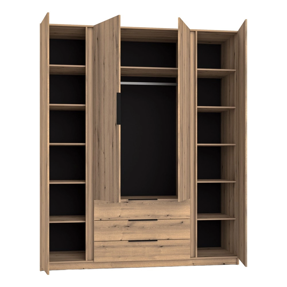 Szafa jest skonstruowana z 4 drzwi oraz 3 szuflad wysuwanych na prowadnicach Quadro. Szuflady Quadro charakteryzują się płynną pracą oraz wysoką odpornością na duże obciążenie. Szafa gwarantuje komfortowe i bezproblemowe korzystanie oraz trwałość całego mebla przez wiele lat użytkowania. Dębowa kolorystyka sprawia, że szafa na ubrania z powodzeniem sprawdzi się jako szafa do sypialni, jako szafa do przedpokoju lub szafa do pokoju dziecięcego. Szafa Kastano VI będzie również świetnym wyborem do pokoju niemowlęcego. Doskonale sprawdzi się także w roli garderoby do przedpokoju.