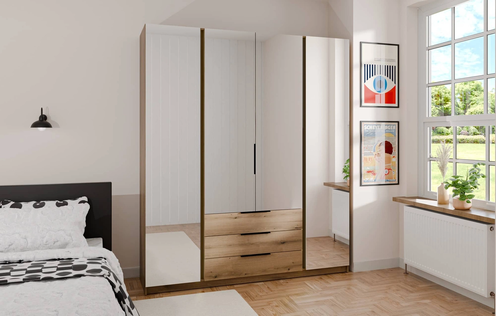 Szafa Kastano VI dzieli się na część z drążkiem na ubrania wiszące i część z półkami. Pojemne szuflady zapewnią dodatkową przestrzeń na przechowywanie. Drzwi szafy zostały wykończone dużymi lustrami, które optycznie powiększą i rozjaśnią pomieszczenie. Wykonanie szafy z wysokiej jakości płyty laminowanej o grubości 16mm zapewnia trwałość i stabilność szafy, co gwarantuje długotrwałą satysfakcję z użytkowania.