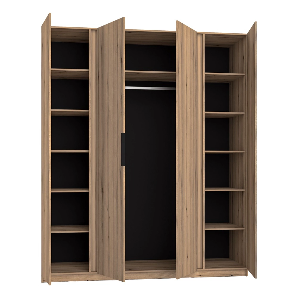 Szafa Kastano XIII została zaprojektowana z myślą o praktycznym podejściu do organizacji przestrzeni. Imponująca pojemność szafy pozwoli na harmonijne uprządkowanie każdej garderoby oraz niezbędnych akcesoriów, zachowując przy tym niezwykłą estetykę i elegancję. Modna kombinacja kolorystyczna, a także obecność ozdobnych lameli w kolorze dąb evoke na drzwiach szafy zapewni niebanalny akcent stylistyczny w każdym wnętrzu. Prosta konstrukcja oraz geometryczne kształty doskonale odzwierciedlają współczesne trendy. Dopełnieniem frontów szafy do pokoju są metalowe uchwyty krawędziowe, które poza swoją podstawową funkcją są również stylowym elementem dekoracyjnym mebla.
