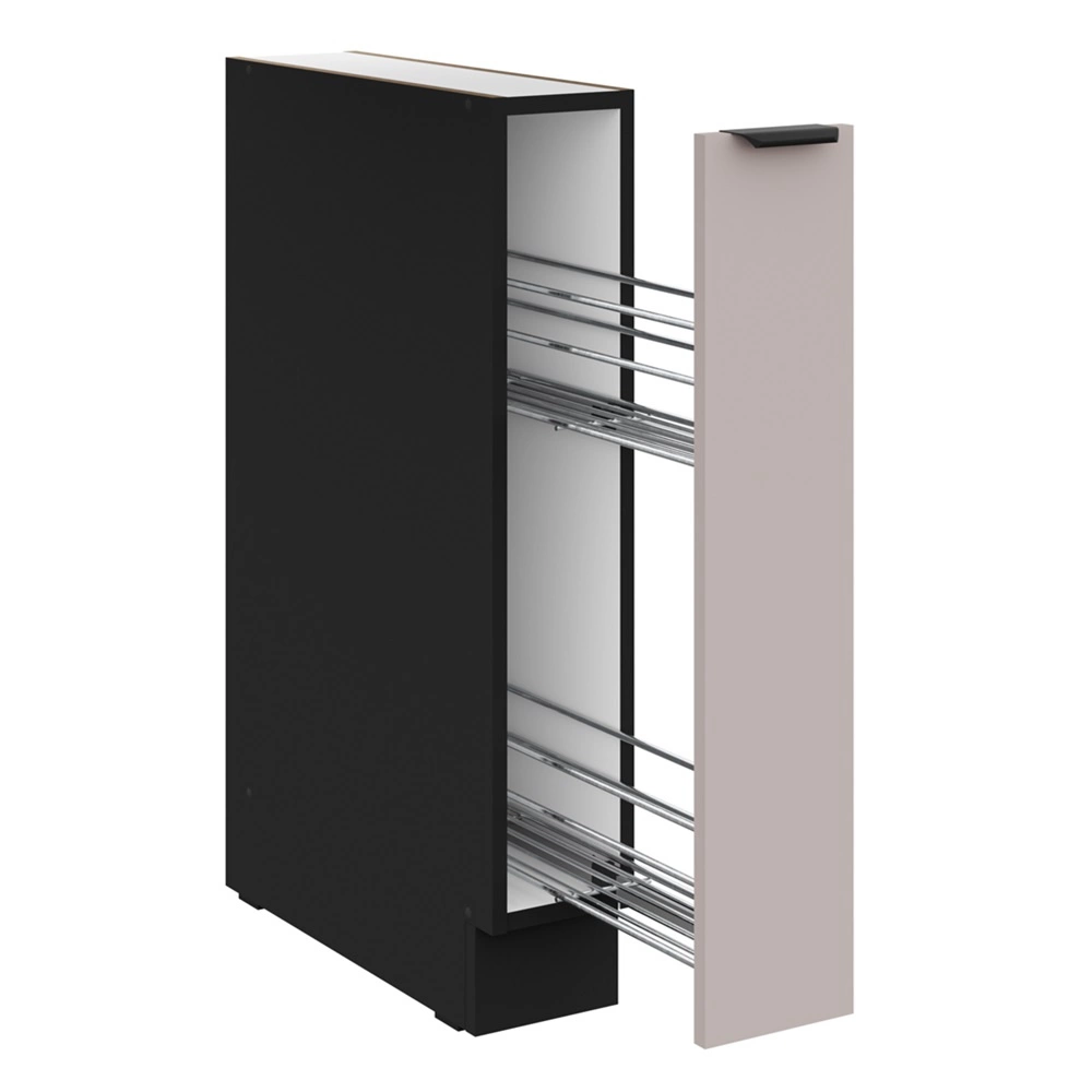 Dzięki uniwersalnemu ustawieniu, meble kuchenne dopasują się do wnętrza każdej kuchni. Czarne korpusy przełamane frontami w orzechowym i beżowym odcieniu podkreślają elegancje szafek kuchennych. Stylowym dopełnieniem frontów szafek kuchennych są czarne, metalowe uchwyty krawędziowe, które poza swoją podstawową funkcją dodają meblom szczególnego charakteru.