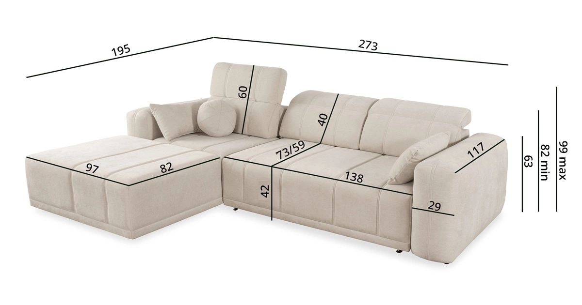 Wymiary mebla pozwolą na zapełnienie przestrzeni w przestronnym salonie lub pokoju dziennym. Szerokość narożnika 273 cm, wysokość maksymalna 99 cm oraz głębokość 195 cm. Powierzchnia spania narożnika wynosi 138x213 cm. Wysokość siedziska mebla to 42 cm a maksymalna wysokość oparcia wynosi 60 cm. Sprężyny faliste oraz pianka poliuretanowa T30 to materiał, z którego wykonane zostało siedzisko narożnika. Oparcie z regulowanymi zagłówkami pozwoli na łatwe dostosowanie kąta nachylenia zagłówków do swoich preferencji oraz daje gwarancję wygodnego wypoczynku po długim dniu, które docenisz Ty, Twoi bliscy a także goście, którzy zasiądą na tym wyjątkowym narożniku.