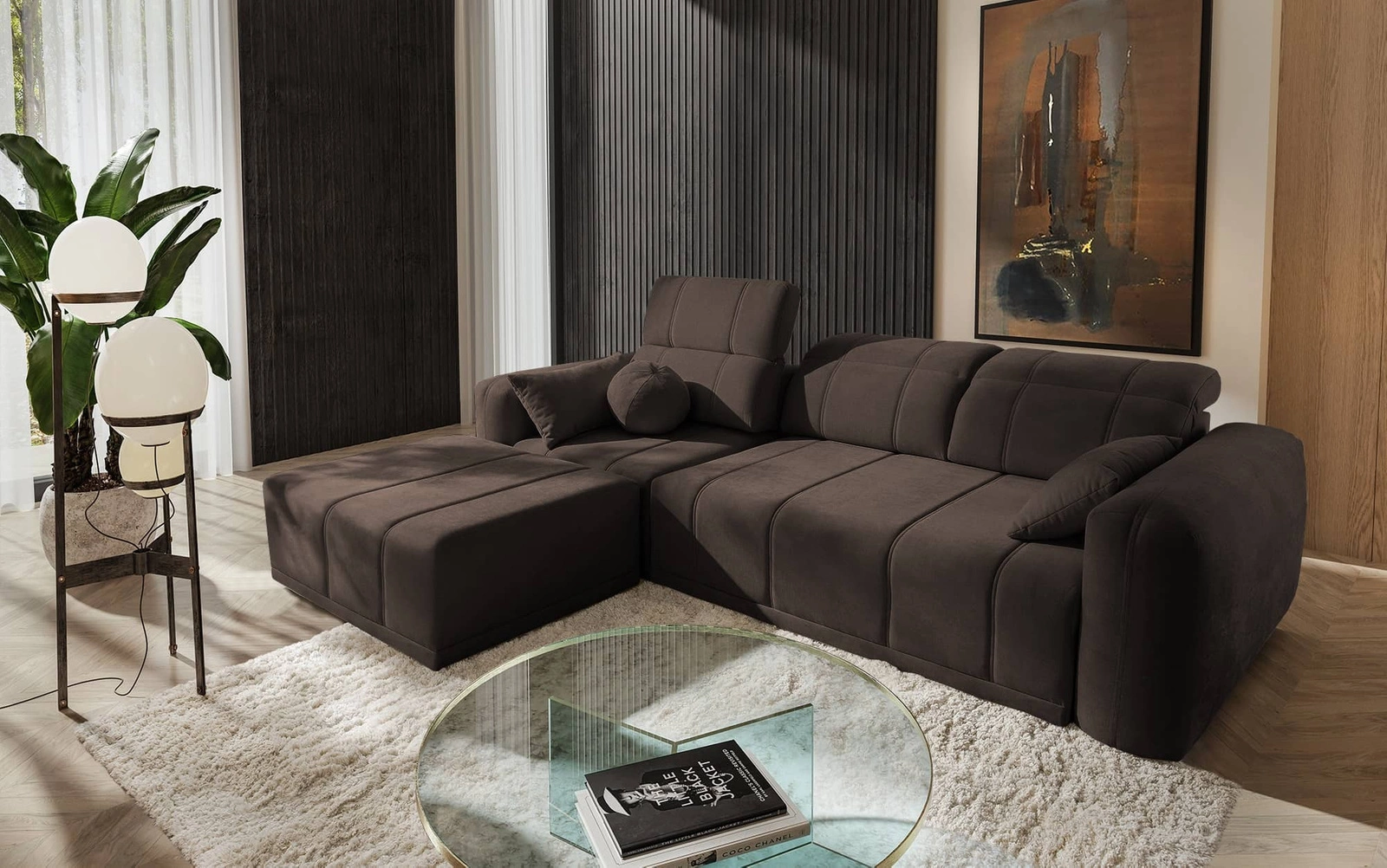 Narożnik z funkcją spania Cetara brązowy lewostronny stylowy design komfortowe przesuwane oparcia regulowane zagłówki