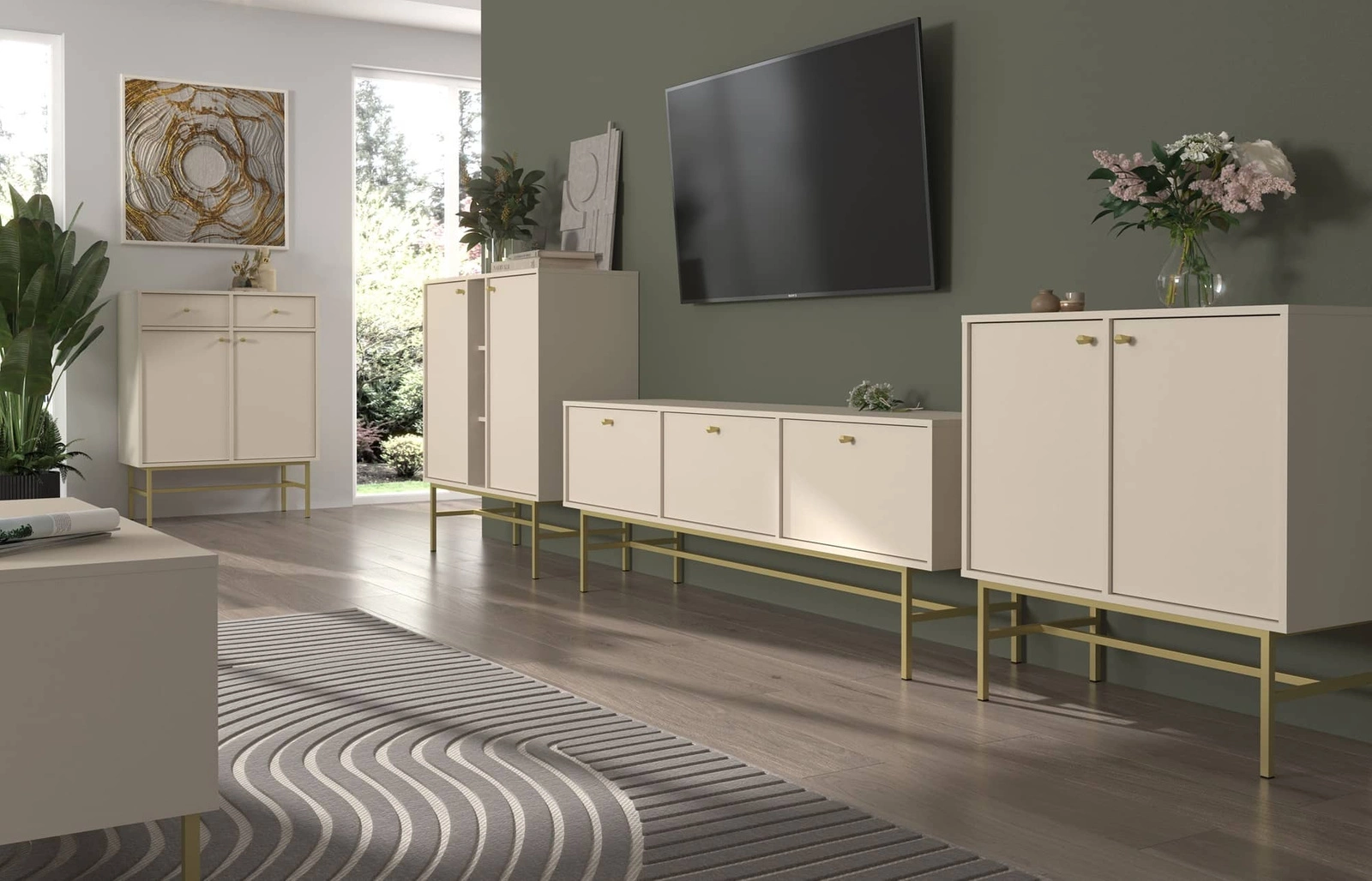 Szafka pod telewizor Kioto to zachwycający mebel o szczególnym i niepowtarzalnym charakterze. Niezwykłe połączenie beżu w piaskowym odcieniu ze złotymi uchwytami sprawia, że całość prezentuje się subtelnie oraz bardzo stylowo. Cofnięte względem korpusu fronty nadają finezji i elegancji dodatkowo tworząc efektowną dekorację. Szafka pod telewizor z kolekcji Kioto to wyjątkowy projekt, który swoją formą i designem idealnie wpisuje się w aranżacje w stylu japońskim oraz nowoczesnym.