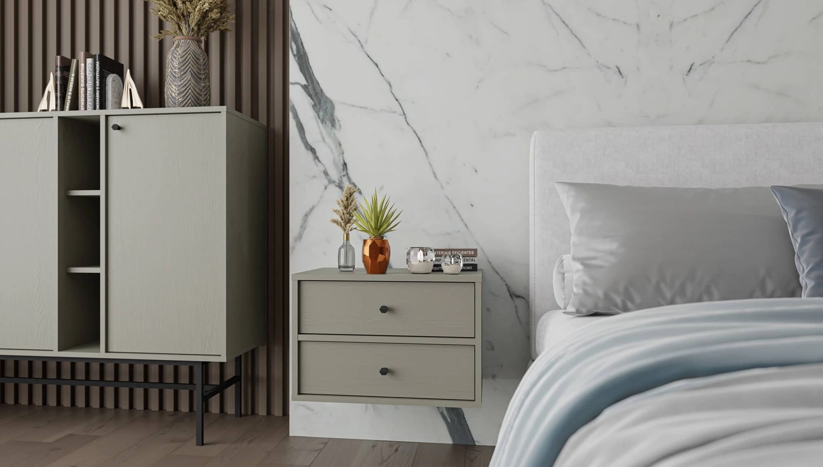 Szafka nocna wisząca Kioto IV w kolorze eukaliptus to stylowy mebel, który idealnie wkomponuje się w każdą aranżację sypialni.