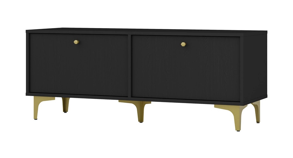 Szafka RTV Kioto I 121 cm czarny grafit elegancka szafka z drzwiami otwieranymi do dołu ponadczasowa kolorystyka złote dodatki