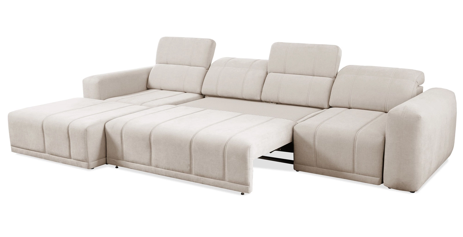 Wymiary mebla pozwolą na zapełnienie przestrzeni w przestronnym salonie lub pokoju dziennym. Szerokość narożnika 346 cm, wysokość maksymalna 99 cm oraz głębokość 195 cm. Powierzchnia spania narożnika wynosi 138x213 cm. Wysokość siedziska mebla to 42 cm a maksymalna wysokość oparcia wynosi 60 cm. Sprężyny faliste oraz pianka poliuretanowa T30 to materiał, z którego wykonane zostało siedzisko narożnika. Oparcie z regulowanymi zagłówkami pozwoli na łatwe dostosowanie kąta nachylenia zagłówków do swoich preferencji oraz daje gwarancję wygodnego wypoczynku po długim dniu, które docenisz Ty, Twoi bliscy a także goście, którzy zasiądą na tym wyjątkowym narożniku.