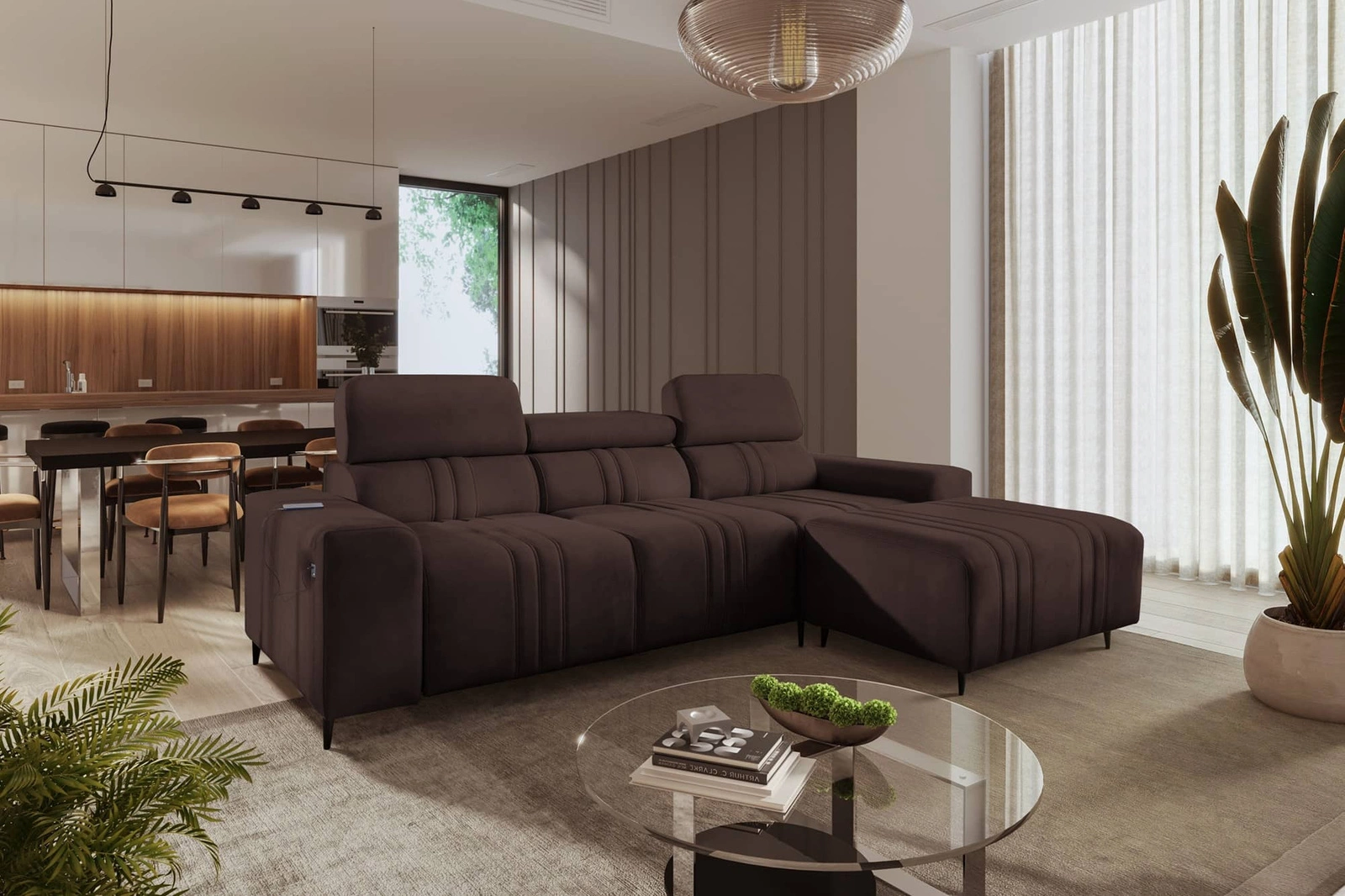 Narożnik Castel w kolorze brązowym z regulowanymi zagłówkami to niezwykle elegancki mebel o ciekawym wykończeniu.