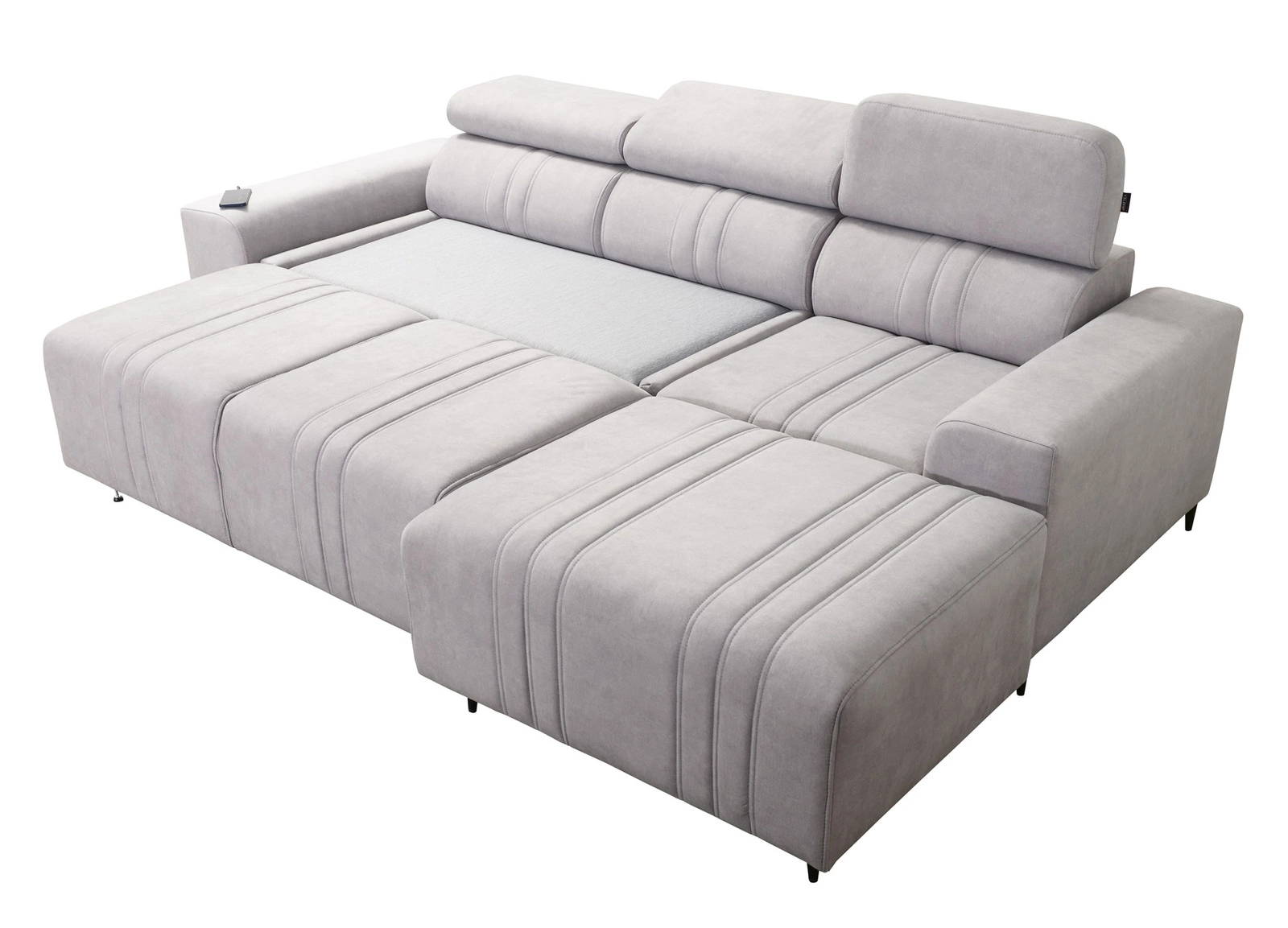 Dodatki tego mebla, które docenią wszyscy użytkownicy to pojemnik na pościel, regulowane zagłówki oraz gniazdo ładowania USB w boczku narożnika.