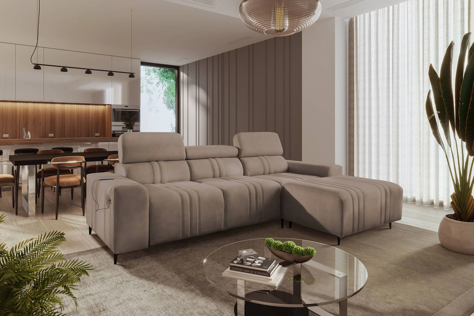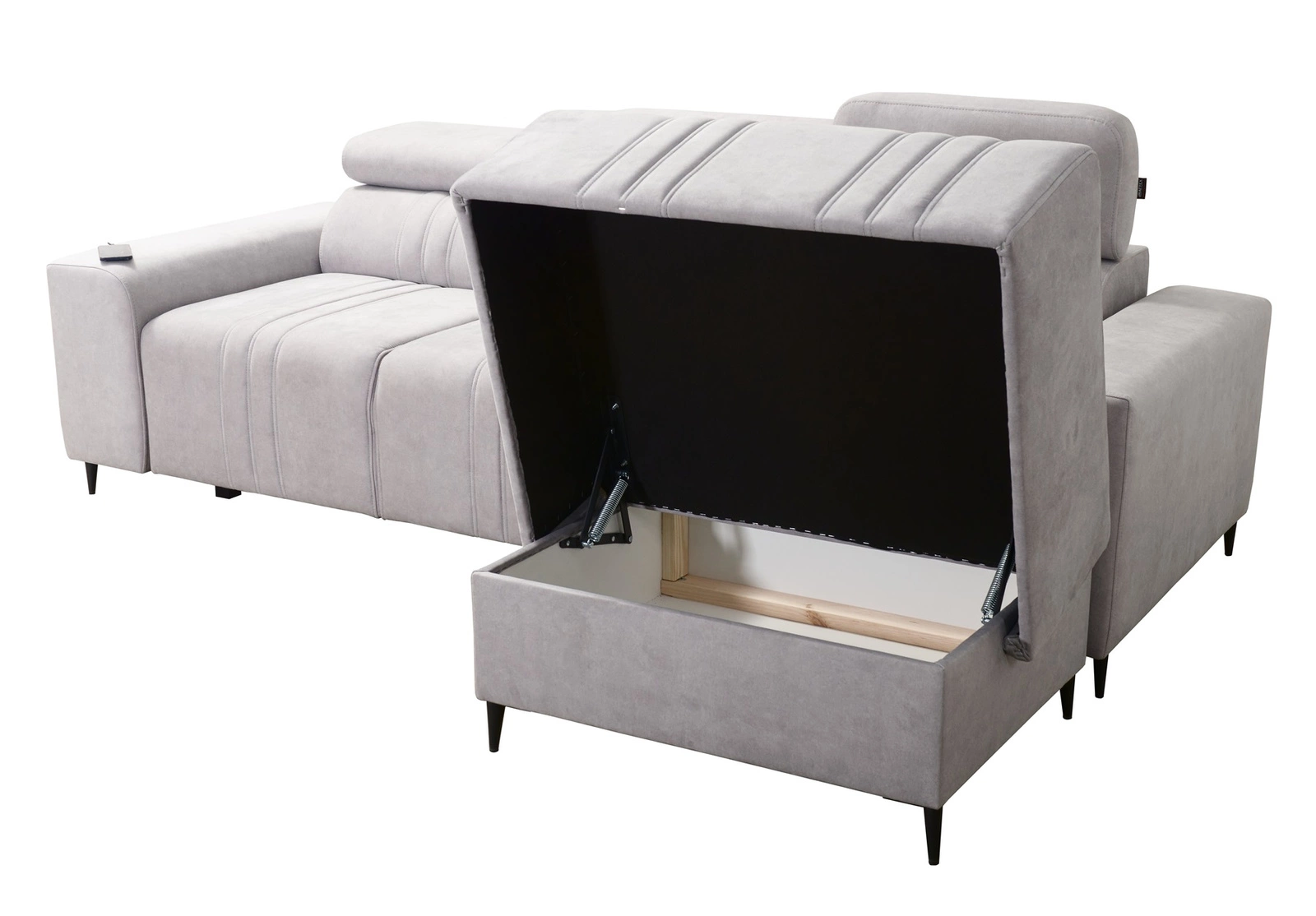 Dodatki tego mebla, które docenią wszyscy użytkownicy to pojemnik na pościel, regulowane zagłówki oraz gniazdo ładowania USB w boczku narożnika.