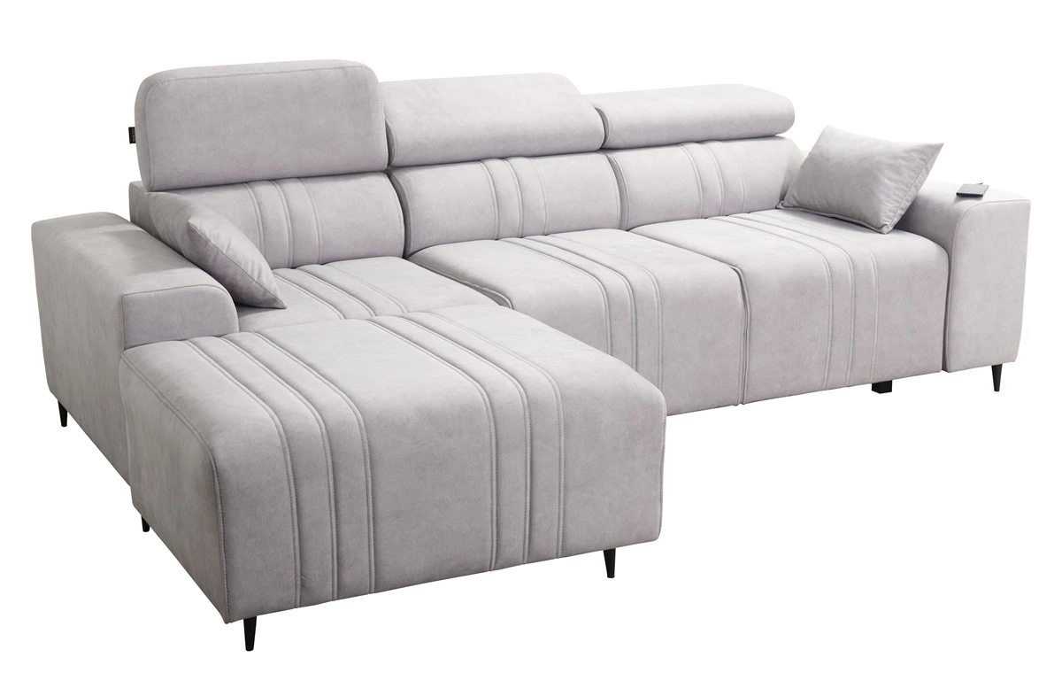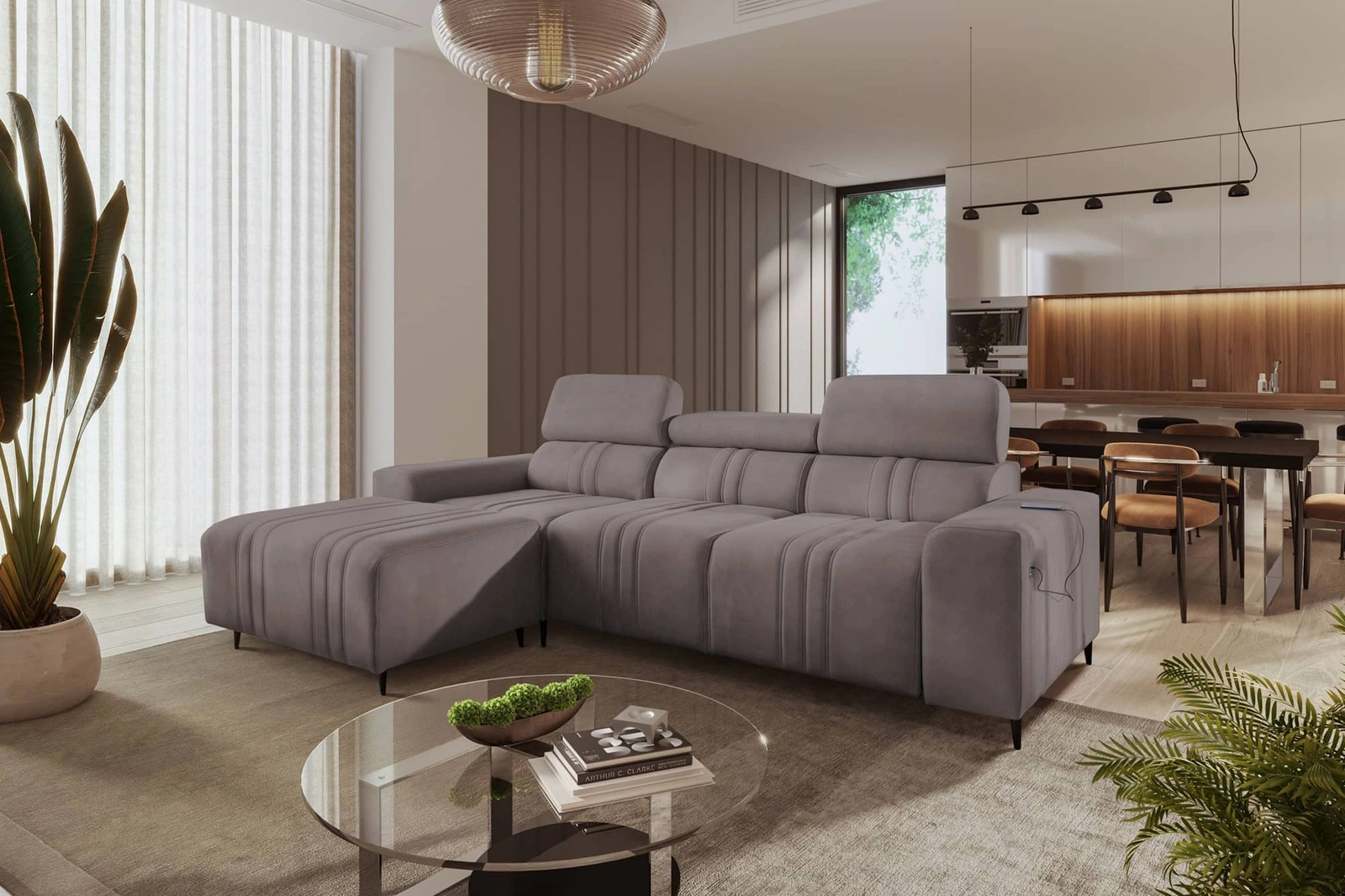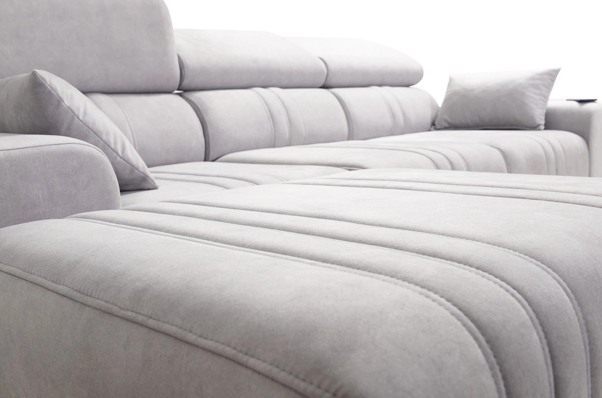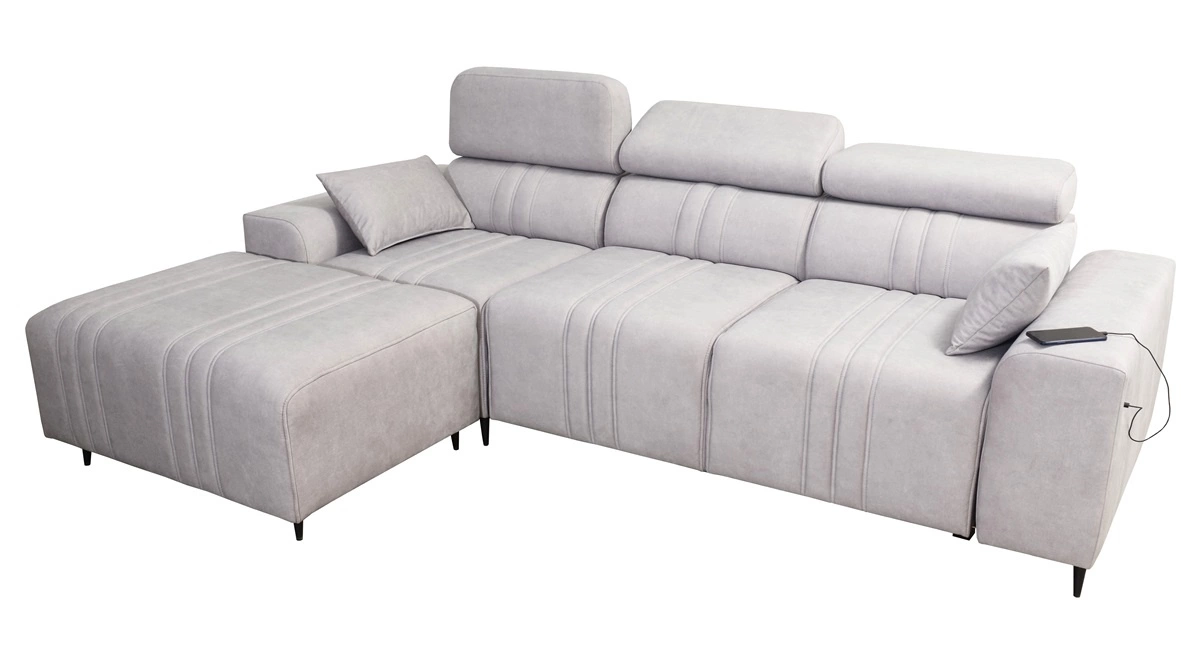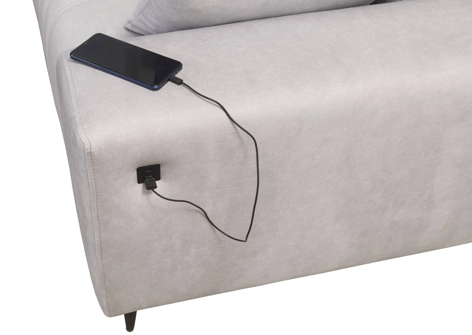 Dodatki tego mebla, które docenią wszyscy użytkownicy to pojemnik na pościel, regulowane zagłówki oraz gniazdo ładowania USB w boczku narożnika.